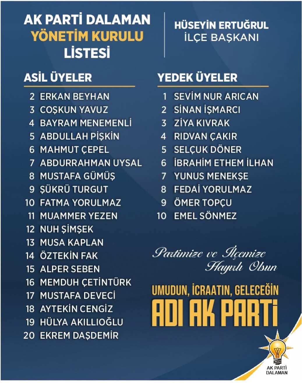 Yenilenme sürecimizde bizlere güvenen ve desteklerini esirgemeyen Genel Merkez Teşkilat Başkanımız Sayın Ahmet Büyükgümüş’e ve İl Başkanımız Sayın Cengizhan Güngör’e şükranlarımızı sunuyoruz. Birlik ve beraberlik içinde, aynı inanç ve kararlılıkla Dalaman’ımıza hizmet etmeye devam edeceğiz. Yenilenen kadromuzla daha güçlü, daha azimli ve daha kararlıyız. Davamız büyük, hedefimiz net: Güçlü Dalaman, güçlü yarınlar.