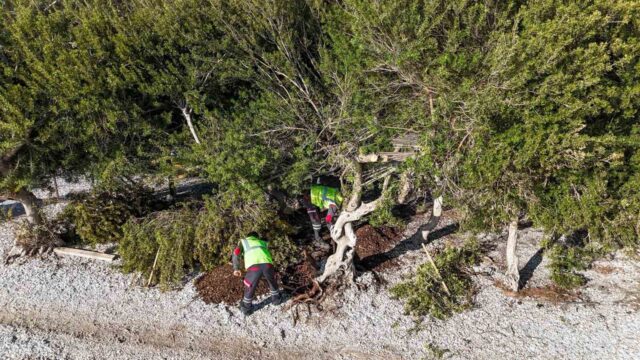 Menteşe Belediyesi Park ve Bahçeler Müdürlüğü ekipleri, Akbük sahil şeridinde devrilen sakız ağacı için kurtarma çalışması başlattı. Özellikle yaz aylarında plajı kullanan vatandaşlar için doğal gölge alanı oluşturan ağaç, ekiplerin titiz çalışmasıyla koruma altına alındı. Ağacın kök ve gövde yapısının zarar görmemesi adına, iş makinesi yerine insan gücü ve halat sistemlerinin kullanıldığı operasyonda, ağaç bulunduğu noktada yeniden ayağa kaldırıldı. Kökleri toprakla buluşturulan ağaç, can suyu verilerek kurtarıldı.