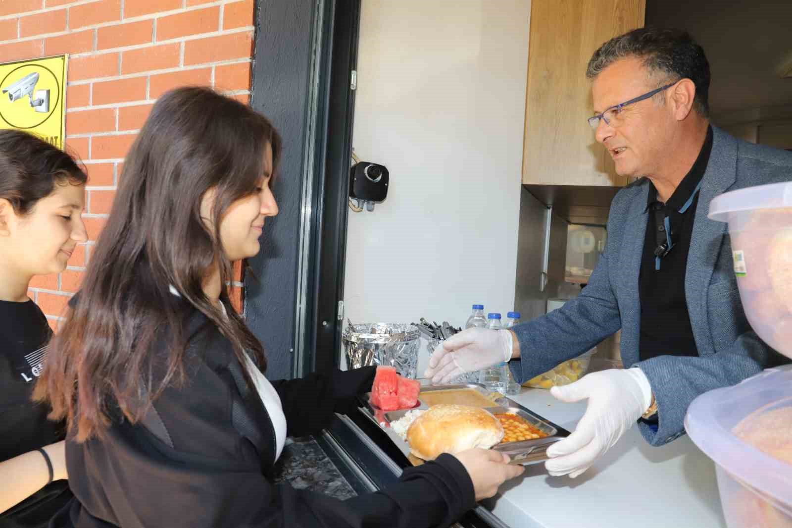 “Öğrencilerimize sahip çıkıyoruz” sloganıyla başlatılan çalışmanın ilk gününde öğrencilerle buluşan ve öğrencilere ilk yemek servisini yapan Alaşehir Belediye Başkanı Ahmet Öküzcüoğlu, “Yeni bir uygulama başlattık. İnşallah beğenirsiniz, menülerimizi takip edin. Her hafta değişik menüler çıkartacağız. Ekonomik bir fiyat olacak. Belki bir sandviç fiyatına olacak. Sizlere 4 çeşit yemek sunacağız. Sizler bizim geleceğimizsiniz. Sağlıklı beslenmenizi istiyoruz. Diyetisyenlerimiz günlük menüleri çocuklarımıza göre düzenleyecekler. Çocukların hem fiziksel, hem de ruhsal gelişimleri beslenmelerine bağlı. Çocuklarımızı dengeli beslemeye çalışacağız. 80 TL gibi bir fiyat alıyoruz, o da bizim maliyetimiz.” dedi.