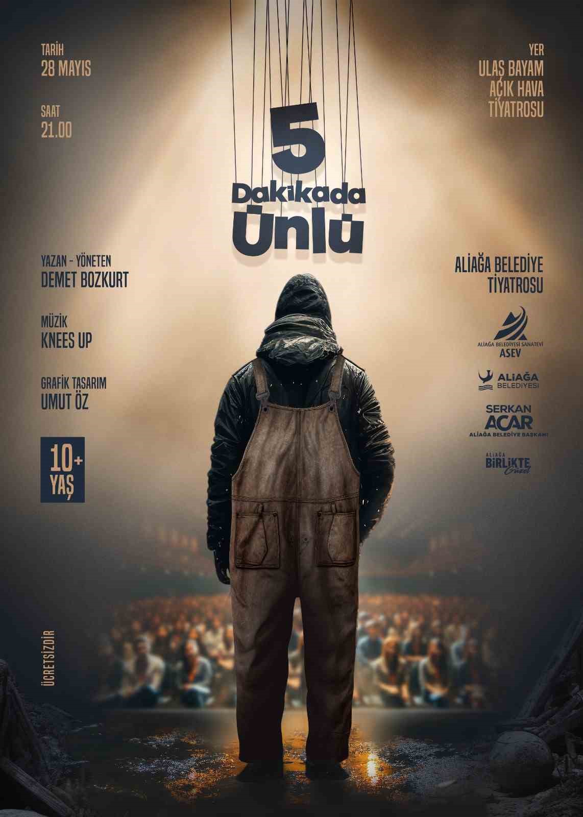 Yazarlığını ve yönetmenliğini Aliağa Belediye Tiyatrosu Sanat Yönetmeni Demet Bozkurt’un üstlendiği ‘5 Dakikada Ünlü’, Aliağa’da perde diyor.