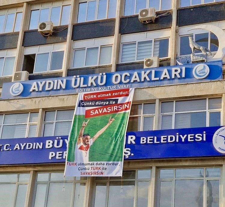 Avusturya maçında attığı golü ’bozkurt’ işareti yaparak kutlayan Türkiye Milli Takım oyuncusu Merih Demiral’ın UEFA’dan 2 maç ceza alması üzerine Aydın Ülkü Ocakları Başkanlığı astığı pankartla Demiral’a destek mesajı verdi.