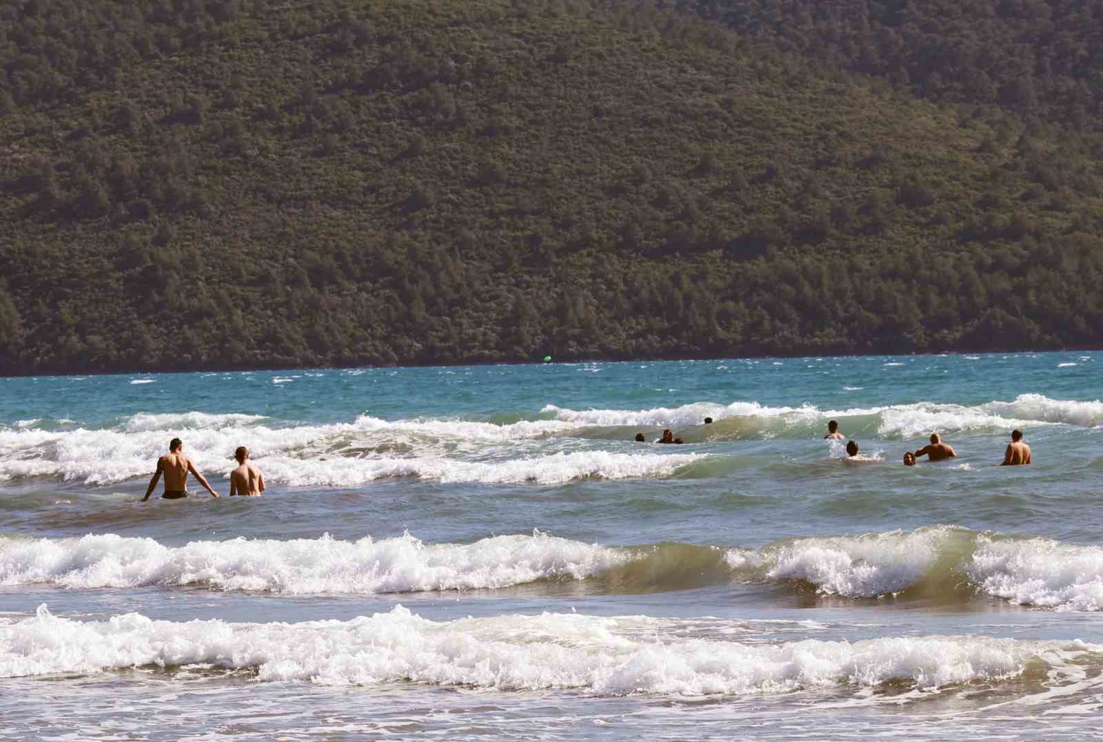 Gökova Körfezi’nde sert esen rüzgara rağmen çok sayıda vatandaş denizde yüzmeyi tercih etti. Sahilden 150-200 metre açıkta insan boyunu geçmeyen derinlik nedeniyle sert esen rüzgar ve dev dalgalara aldırış etmeyen vatandaşlar saatlerce denizde kalmayı ve dalgalarla adeta dans etmeyi tercih ettiler.
