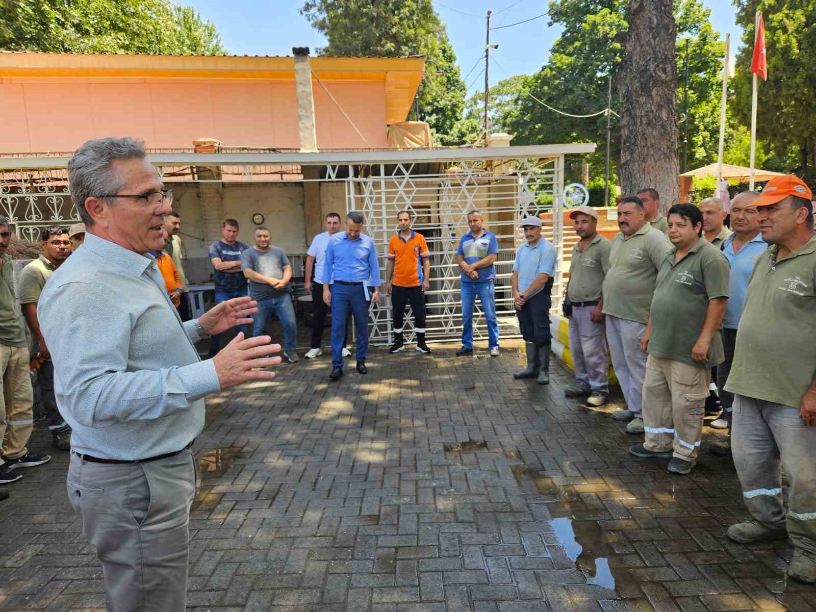 Nazilli Belediye Başkanı Dr. Ertuğrul Tetik; Temizlik İşleri Müdürlüğü şantiyesini ziyaret ederek, bayram süresince gösterdikleri özverili çalışmalardan dolayı personellerine teşekkür etti.