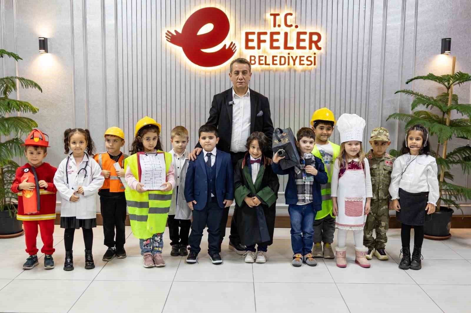 Efeler Belediyesi, bu özel günde kapılarını, çocukların hayallerine açtı. Mimar olmak isteyen bir çocuk belediyenin İmar ve Şehircilik Müdürlüğü’nde projeleri inceledi, doktor olmayı hayal eden bir başkası Sağlık İşleri Müdürlüğü’nde beyaz önlükle odaları gezdi. Gazeteci olmak isteyen çocuk profesyonel fotoğraf makineleriyle başkanın fotoğraflarını çekerken, belediye başkanı olmayı hayal eden minik misafir, Başkan Yetişkin’in makam koltuğuna oturarak geleceğin lideri gibi hissetti.