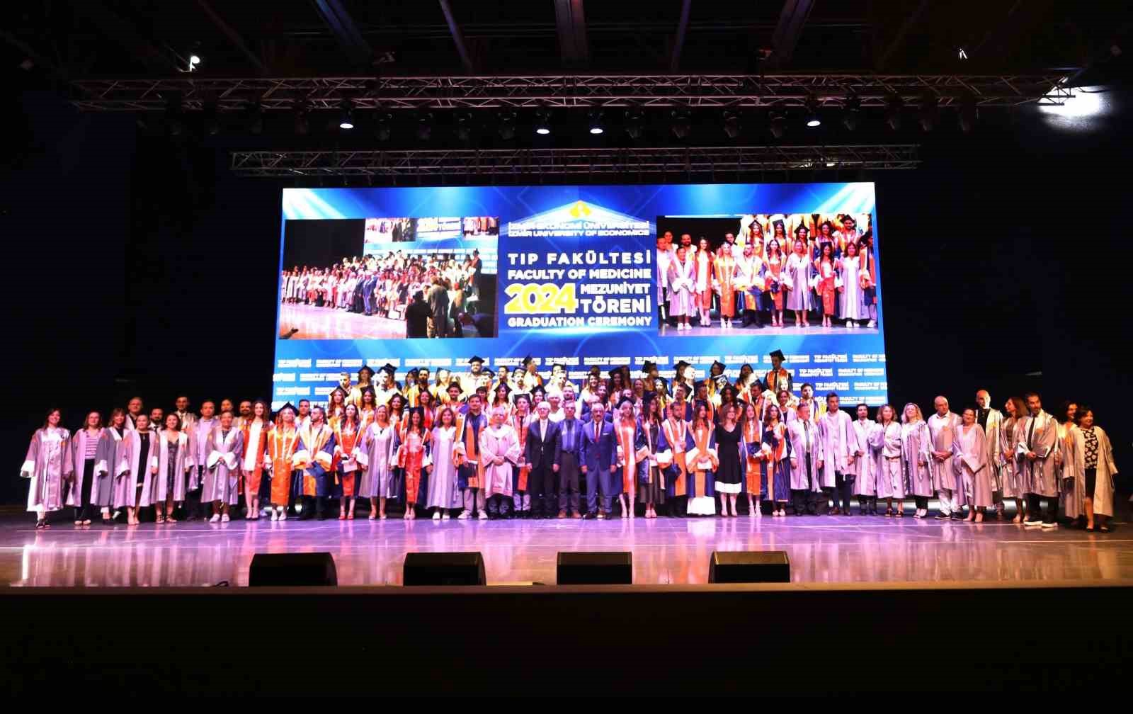 İzmir Ekonomi Üniversitesinin kampüsünde bulunan amfitiyatroda düzenlenen 2023-2024 Akademik Yılı Tıp Fakültesi Mezuniyet Töreni’ne; Rektör Prof. Dr. Yusuf Hakan Abacıoğlu, İzmir Ticaret Odası Meclis Başkanı Selami Özpoyraz ve Meclis Başkan Yardımcısı Mehmet Tahir Özdemir, Medical Point Hastaneler Grubu Yönetim Kurulu Başkan Vekili Veysi Kubba, İzmir Tabip Odası Başkanı Prof. Dr. Mehmet Ceyhun Özyurt, Tıp Fakültesi Dekanı Prof. Dr. İlgi Şemin, İEÜ Medical Point Hastanesi Başhekim Yardımcısı Doç. Dr. Önder Limon, mütevelli heyet üyeleri ve davetliler katıldı.