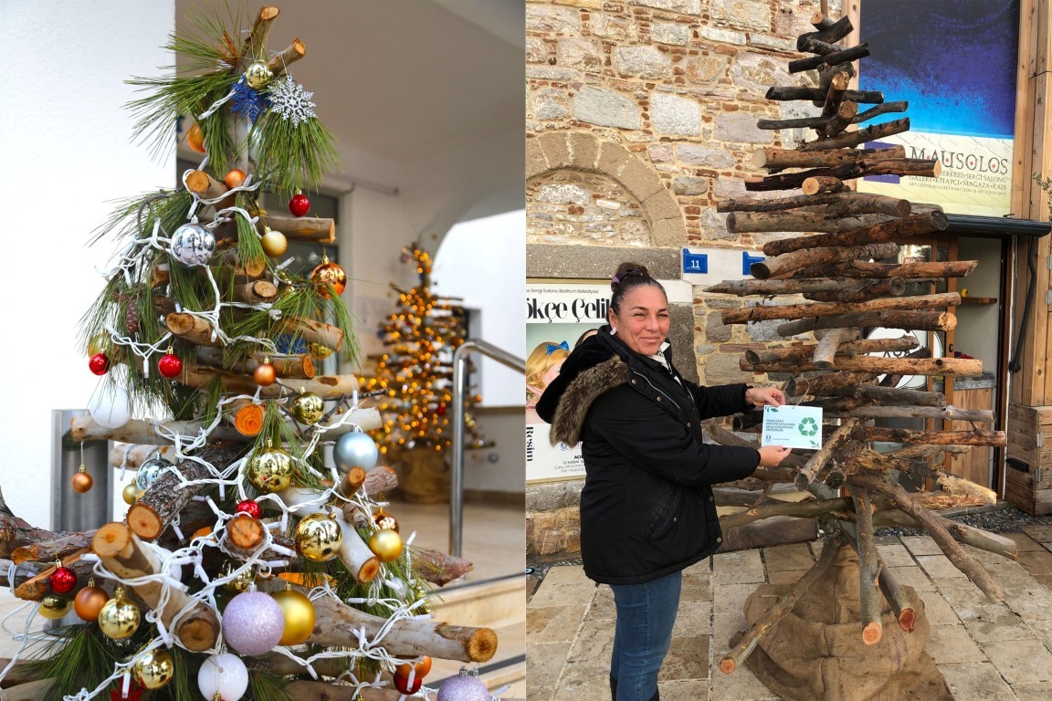 Bodrum Belediyesi, yeni yıl süslemeleri kapsamında ağaç budama çalışmalarından arta kalan odun ve dalları değerlendirerek yılbaşı ağacı yaptı.