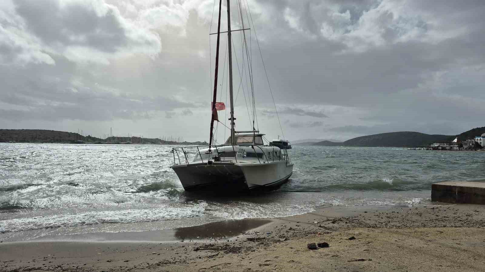 Meteoroloji’nin fırtına uyarısında bulunduğu Muğla’nın Bodrum ilçesinde beklenen fırtına sabah saatlerinde başladı. Fırtına sebebiyle Gümbet Koyu’nda demirli tekneler kıyıya sürüklendi. İlk olarak bir motoryat ile katamaran tipi yelkenli kıyıya sürüklendi. Tekneler, daha fazla hasar almaması için karaya bağlanarak sabitlendi.