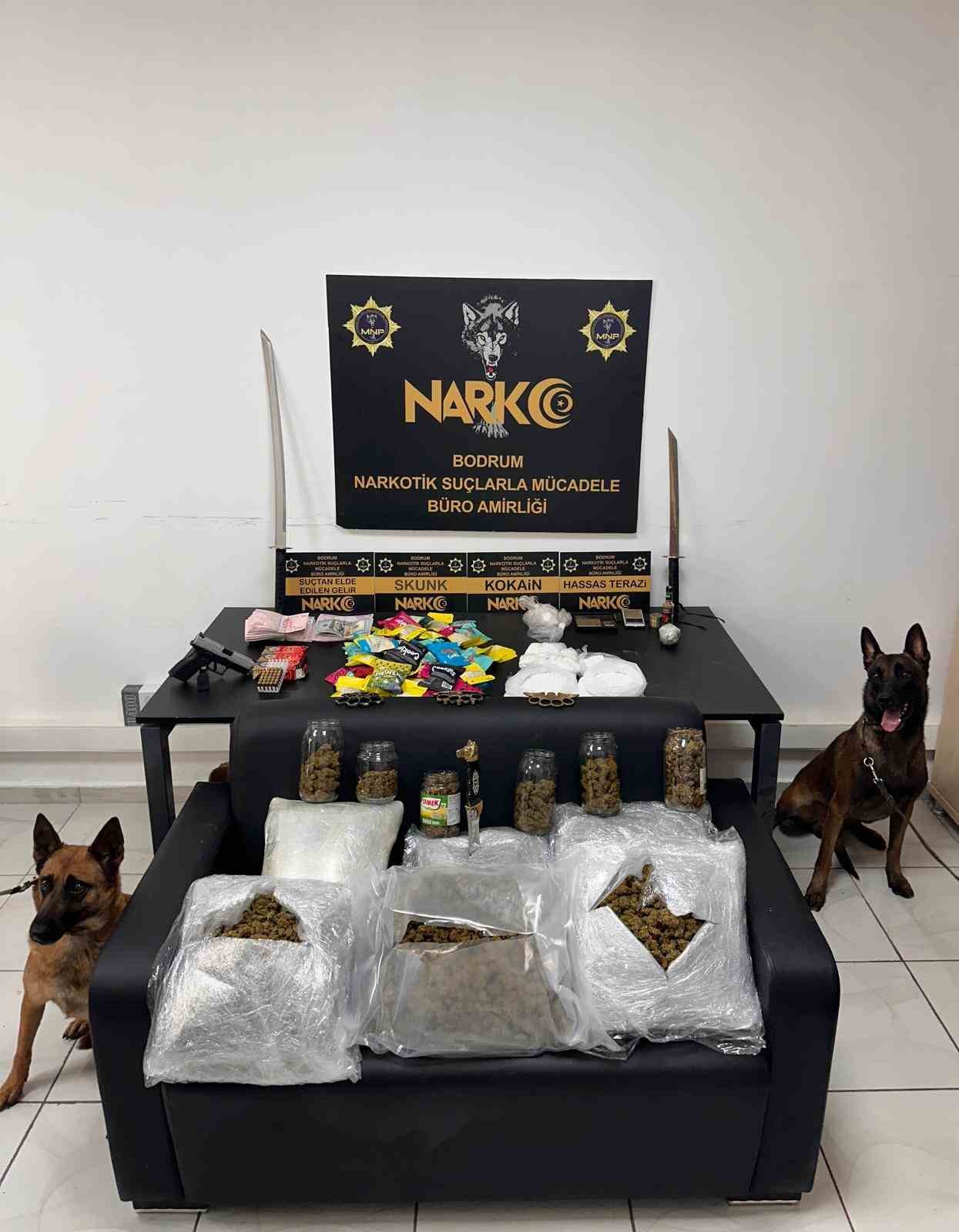Edinilen bilgiye göre, Bodrum’da uyuşturucu madde ticareti yaptıkları tespit edilen şüphelilerin yakalanmasına yönelik çalışma başlatıldı. Narkotik Suçlarla Mücadele Şube Müdürlüğü’nün Bodrum İlçe Emniyet Müdürlüğü ve Özel Harekat Timleri ile birlikte 6 ayrı adrese yaptığı operasyonda 7 şüpheli yakalanarak gözaltına alındı. Yapılan aramalarda 7 kilogram skunk maddesi, 655 gram kokain, 2 adet hassas terazi, 1 adet ruhsatsız tabanca ve 158 adet MKE ibareli 9.19 fişek, 171 bin TL, bin 500 dolar, 600 euro ele geçirildi. Gözaltına alınan şüphelilerle ilgili adli işlemlerin devam ettiği bildirildi.