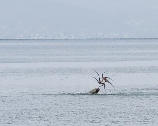 İzmir’in Çeşme ilçesinde sahile yakın bir noktada ahtapot avlayan Akdeniz fokunun dakikalar süren mücadelesi, kıyıda izleyenleri şaşkına çevirdi.
