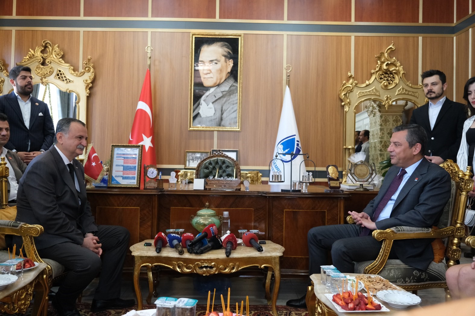 CHP Genel Başkanı Özgür Özel, memleketi Manisa’da belediye başkanlarına yönelik ziyaretlerine devam etti. Manisa’nın merkez Yunusemre Belediyesini ziyaret eden Özel, Başkan Semih Balaban’la bir araya geldi. Özel’i makamında ağırlayan Başkan Balaban, “Genel Başkanımız Özgür Özel’in bizi makamımızda ziyaret etmesinden dolayı kendisine teşekkür ediyoruz. Kendisinin demokrat tavrı sayesinde bu makamlardayız. Kendisine teşekkür ediyoruz” dedi.