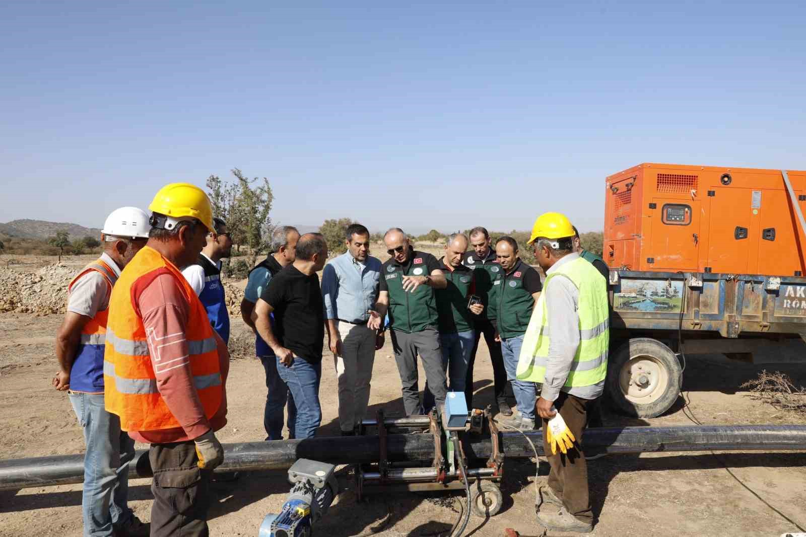 Aydın’ın Çine ilçesinde yapımına başlanan Çine Ovası Sulaması 2. Kısım projesinde çalışmalar aralıksız devam ederken, yer altına indirilen sulama borularının montajı yapılıyor.