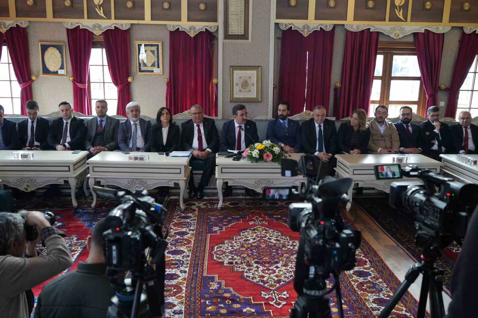 Bir dizi ziyaret ve temaslarda bulunmak üzere Manisa’ya gelen Cumhurbaşkanı Yardımcısı Cevdet Yılmaz, Yunusemre Belediye Başkanı Mehmet Çerçi’nin ev sahipliğinde hemşeri dernekleri temsilcileriyle İrfan Meclisi’nde bir araya geldi. Burada açıklamalarda bulunan Yılmaz, “Ekonomide istikrar yönünde çalışmalarımızın yanı sıra yerli milli teknolojide büyük bir dönüm nokta noktasını bu hafta içinde yine birlikte yaşadık. Türk Havacılık ve Uzay Sanayi TUSAŞ tarafından geliştirilen Milli Muharip Uçak Kaan ilk uçuşunu başarıyla gerçekleştirdi. Hepimize gerçekten gurur veren bir anı daha yaşamış olduk. Tüm Türkiye duasıyla ilk kez gök vatan ile buluşan 5. nesil savaş uçağımız KAAN ile yılların emeği meyvelerini vermeye başladı. Önümüzdeki süreçlerde daha bir gelişerek inşallah hava kuvvetlerimizin envanterine girdiğini de hep birlikte göreceğiz. Buna başlangıçta neler dendiğini hepiniz hatırlıyorsunuz. ’Kalorifer peteği’ diyen oldu, ’demir yığını’ diyen oldu, küçümsemeye çalışanlar oldu. Çok şükür 3 binden fazla mühendisimiz Türk halkının hayalleri için projeye yüreklerini koydular ve o sözleri söyleyenleri mahcup ettiler. Mahcup etmeye de devam edecekler inşallah yeni projelerle. Savunma sanayimizin geldiği noktayla ve mühendislerimizin başarısıyla gurur duyuyoruz. Tabii bunlar kendiliğinden gerçekleşmiyor. Cumhurbaşkanımızın güçlü siyasi iradesi, siyasi istikrar zemininde bunları gerçekleştiriyoruz. Kararlı olunca işte bunlar başarılıyor, gerçekleştiriliyor. Daha da ileriye inşallah gideceğiz. Şimdi önümüzde Türkiye’nin ilk yerli ve milli haberleşme uydusu Türksat 6A’nın uzaya fırlatılması var. Dünya üzerinde haberleşme uydusu üretebilen ilk 11 ülkeden birisi olarak Türksat 6A ile uzayda inşallah iş sahibi olacağız. Yine geçtiğimiz günlerde astronotumuz biliyorsunuz gitti, geldi. Bu da uzayı artık yeni nesillerin gündemine tam anlamıyla yerleştirdi. İnanıyorum ki gelecekte uzayda da Türkiye çok farklı bir konumda olacaktır. Bu işler bir anda olmuyor. İşte bir süreçle adım adım kararlı bir şekilde bu yönde hareket etmeye devam edeceğiz” dedi.