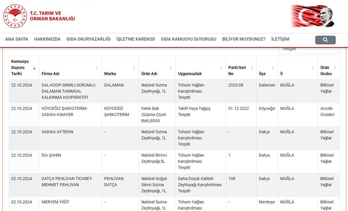 Son açıklanan listede, Dalaman Belediye Başkanı Sezer Durmuş’un başkanlığını yürüttüğü S.S Dalaman Tarımsal Kalkınma Kooperatifi’nin zeytinyağında sahtecilik yaptığı ortaya çıktı. Kooperatif, organik gıda sağlamak ve çiftçilere destek olmak amacıyla kurulmuştu.
