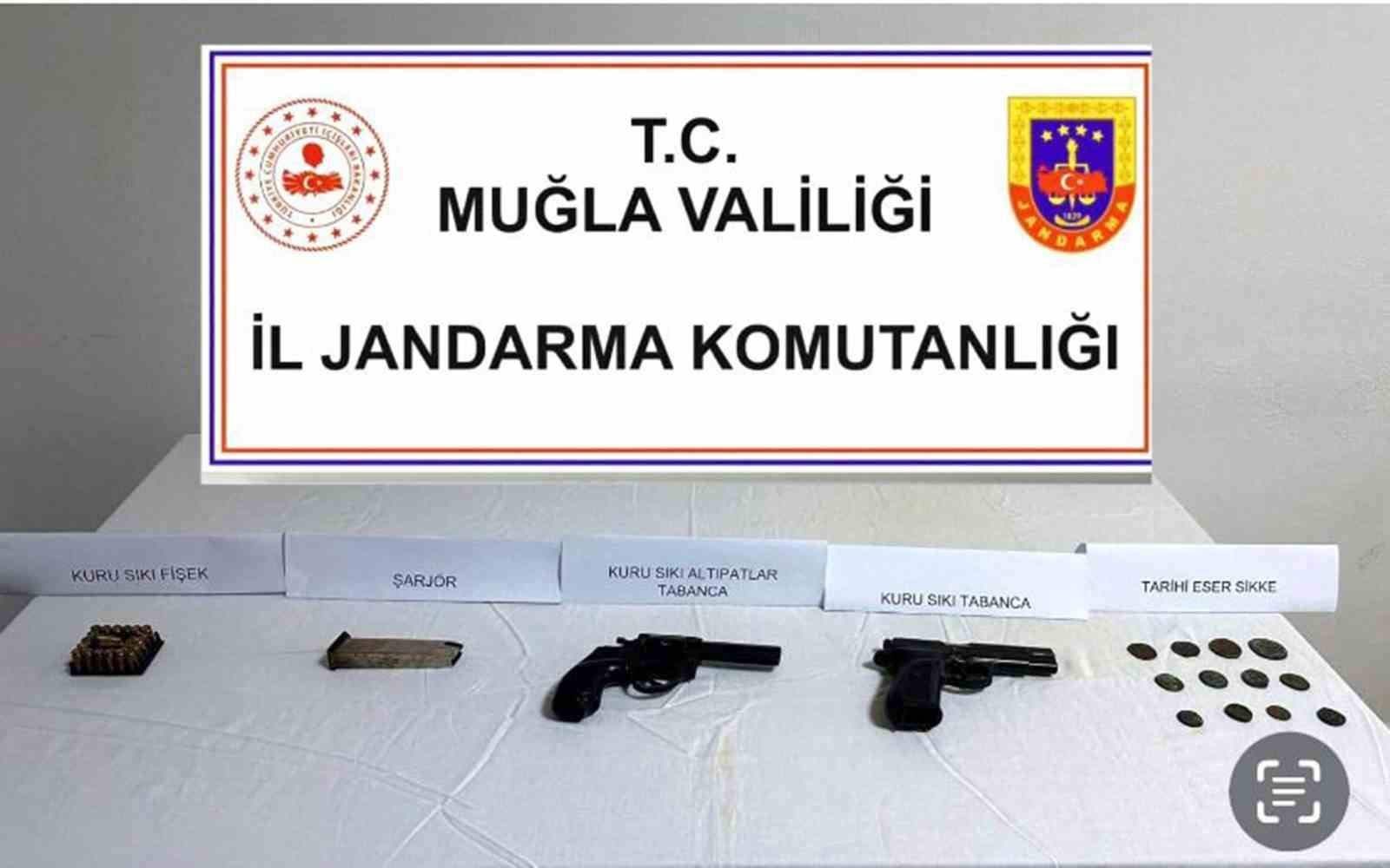 Yapılan aramada, 12 adet Roma dönemine ait sikke, 2 adet kurusıkı tabanca, tabancaya ait şarjör ve 21 kurusıkı tabanca fişeği ele geçirildi. Datça Cumhuriyet Başsavcılığınca yürütülen faaliyet ile ilgili adli işlemlere başlandı.