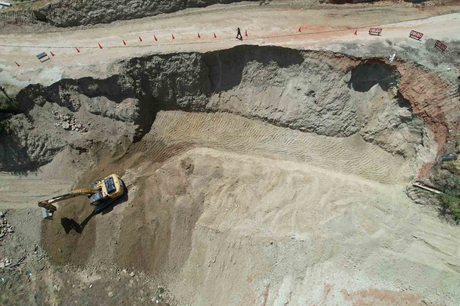 Denizli’de toprak kayması sonucu bir kısmı çöken yolda Büyükşehir Belediyesi ekiplerinin çalışmaları sürüyor.