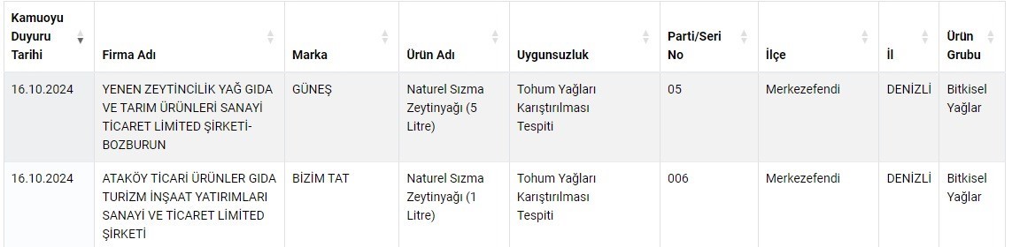 Tarım ve Orman Bakanlığı taklit ve tağşiş ürün listesini güncelleyerek tekrar yayımladı. Tarım ve Orman Bakanlığı tarafından kamuoyunda paylaşılan listede Denizli’den iki firma yer aldı. Yapılan denetimler sonucunda iki firmanın zeytinyağına farklı yağlar karıştırdığı tespit edildi. Merkezefendi ilçesinde faaliyet gösteren Yenen Zeytincilik Yağ Gıda ve Tarım Ürünleri Sanayi Ticaret Limited Şirketi, ürettiği ‘Güneş’ adlı marka ile Ataköy Ticari Ürünler Gıda Turizm İnşaat Yatırımları Sanayi ve Ticaret Limited Şirketi’nin ürettiği ‘Bizim Tat’ adlı zeytinyağlarına tohum yağı karıştırdığı belirlendi.