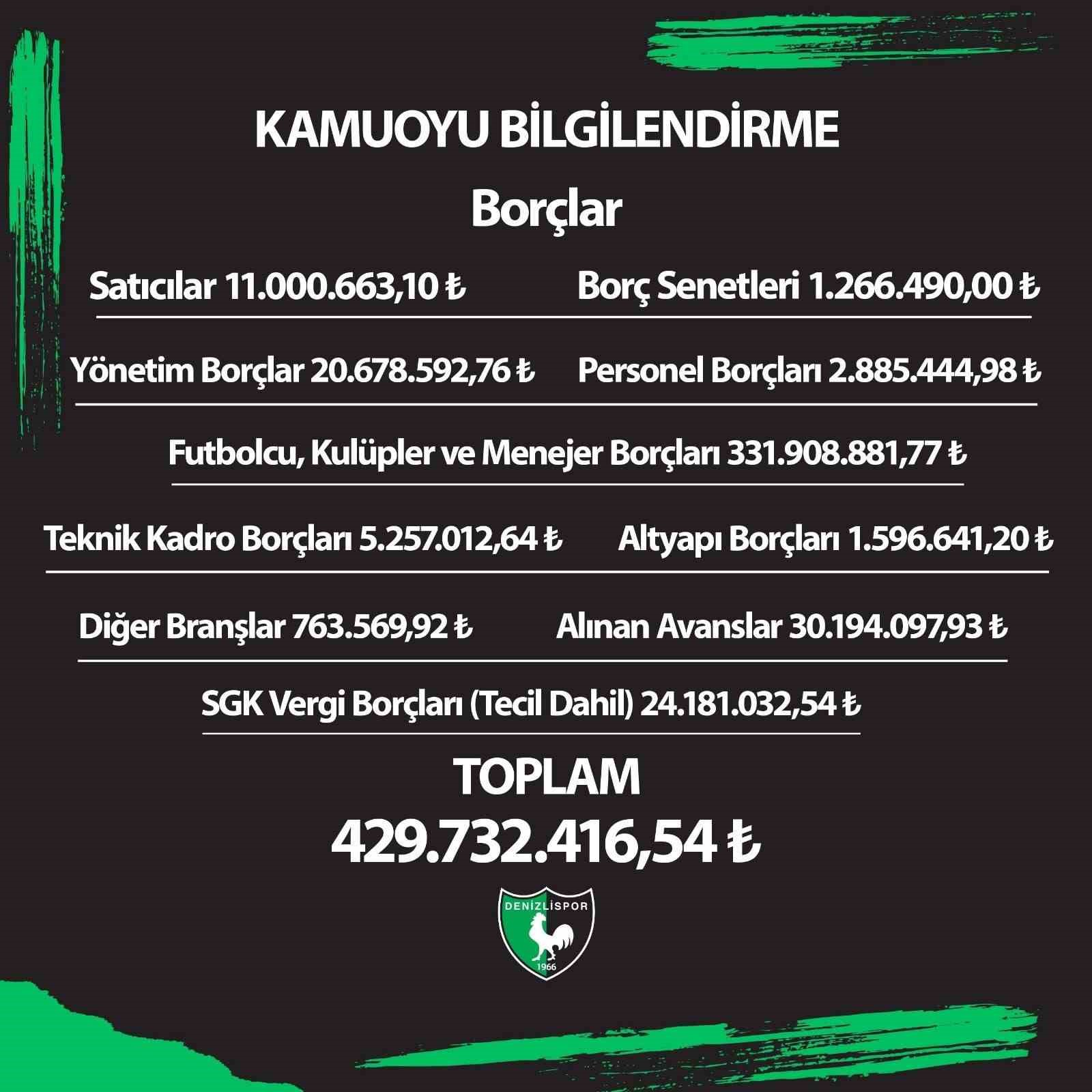 Hesaplanamayan hariç kayıtlı borçların yer aldığı açıklamada; “14 Mayıs 2024 tarihinde yapılan seçimli olağan genel kurulumuzda, delegelerimizin oyları ile Denizlispor Yönetim Kurulu görevine seçildik. Kulübümüzü şeffaf yönetim anlayışı ile yöneteceğimiz konusunda verdiğimiz sözler çerçevesinde ilk olarak mali tabloyu tüm camiamızın bilgisine sunarız. Devir aldığımız borç tutarı 429 milyon 732 bin z16 TL’dir. Kamuoyunun bilgisine sunarız” denildi.