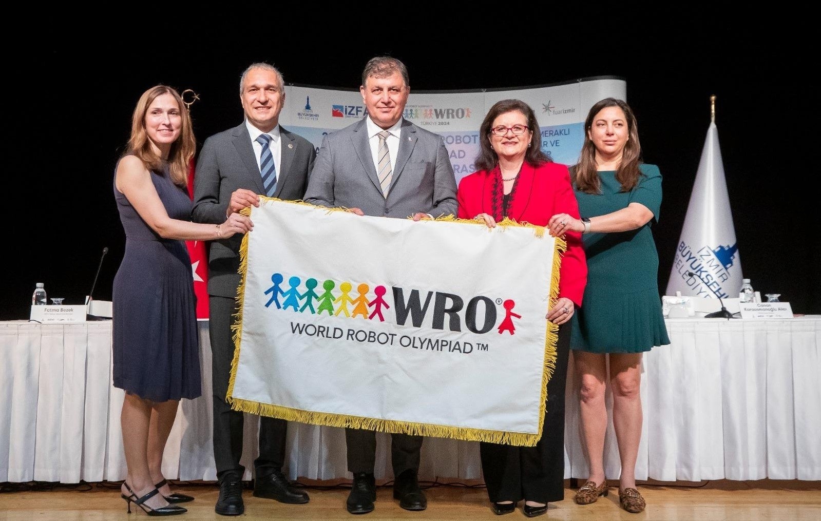 Dünyada robotiğe meraklı çocukları 28-30 Kasım 2024 tarihlerinde İzmir’de buluşturacak Dünya Robot Olimpiyatı (World Robot Olympiad-WRO) Uluslararası Finali, Kültürpark İzmir Sanat’ta yapılan basın toplantısı ile tanıtıldı. Her sene farklı bir ülkenin ev sahipliğinde gerçekleşen Dünya Robot Olimpiyatları, bu yıl İzmir Büyükşehir Belediyesi, İZFAŞ ve Bilim Kahramanları Derneği iş birliğinde yapılacak ve 3 bini aşkın katılımcıyı İzmir’de buluşturacak. İzmir Büyükşehir Belediye Başkanı Dr. Cemil Tugay’ın ev sahipliğinde yapılan toplantıya; CHP Genel Başkan Yardımcısı ve İstanbul Milletvekili Suat Özçağdaş, Bilim Kahramanları Derneği Yönetim Kurulu Başkanı Prof. Dr. Sıddıka Semahat Demir, WRO Türkiye Genel Koordinatörü Fatma Bezek, İZFAŞ Genel Müdürü Canan Karaosmanoğlu Alıcı, İzmir Büyükşehir Belediyesi Meclisi Başkan Vekili Altan İnanç ve basın mensupları katıldı. Konuşmacılar toplantının sonunda, 2023 yılının Kasım ayında Panama’da Panama First Lady’si Yazmin Colón de Cortizo himayesinde gerçekleştirilen uluslararası finalin kapanış töreninde alınan WRO bayrağı ile poz verdi.