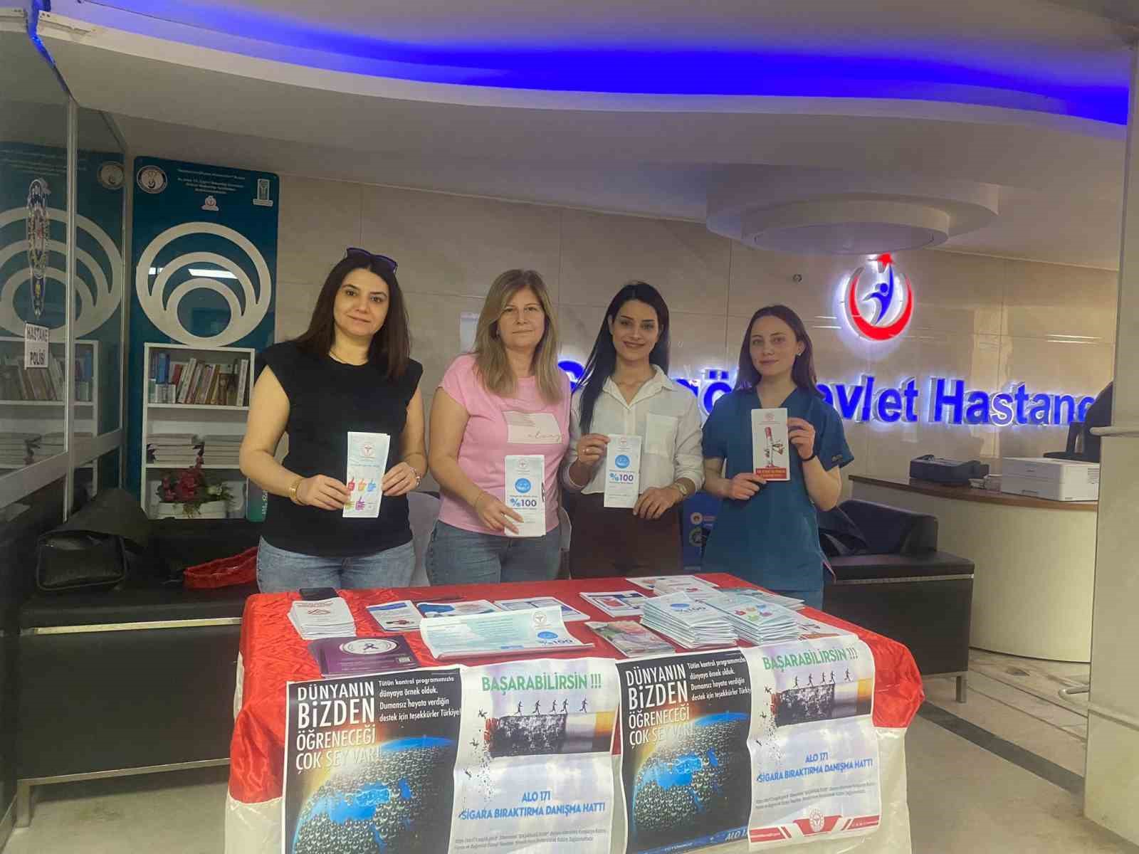 Sarıgöl Devlet Hastanesinde görevli sağlık personeli tarafından Dünya Tütünsüz Günü etkinlikleri kapsamında stant açıldı. Standa gelenlere sigaranın zararları anlatılırken, hasta ve hasta yakınlarına da broşür dağıtılarak farkındalık çalışması yapıldı.