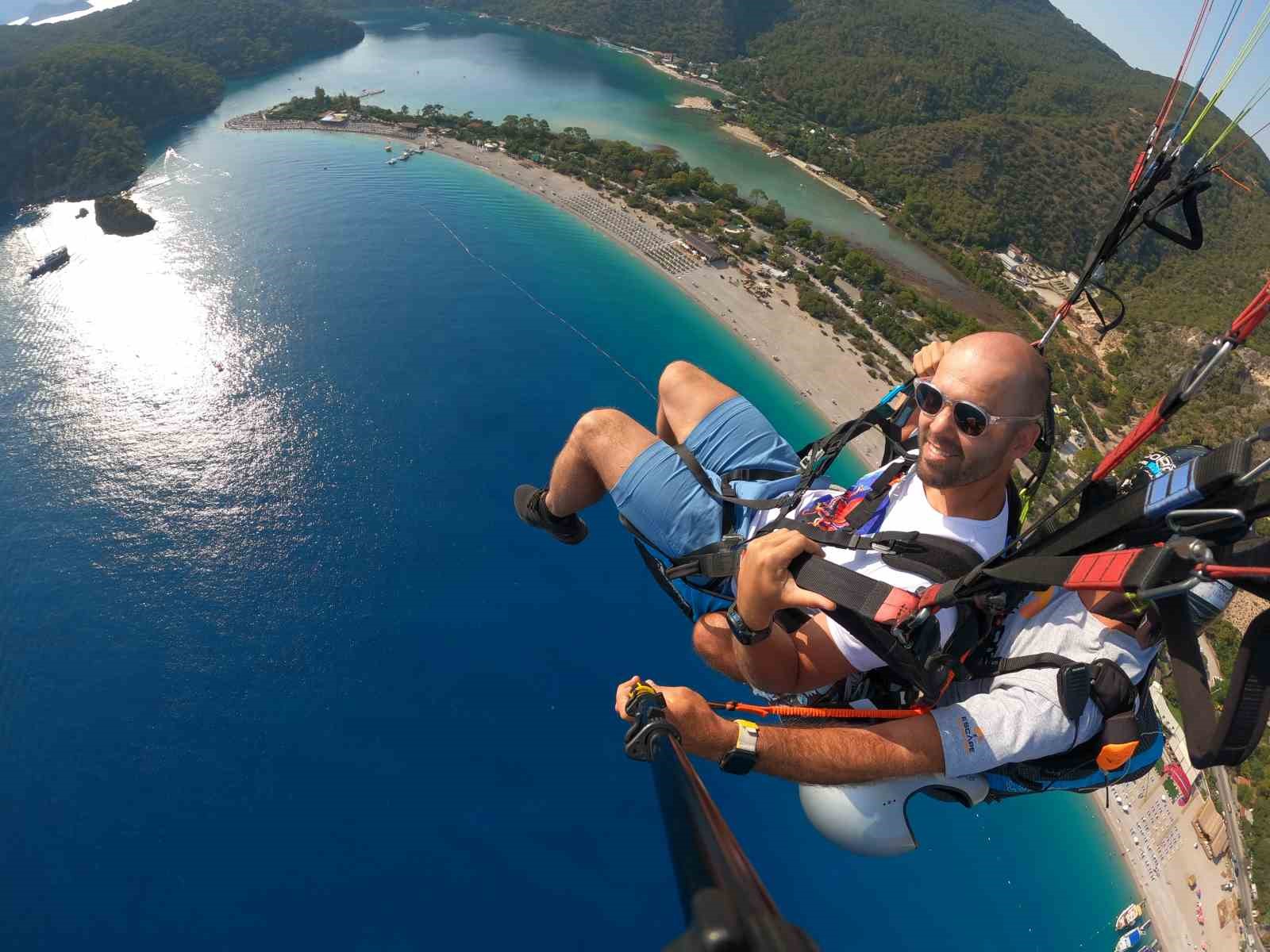 Dünyanın önde gelen serbest dalgıçlarından biri olan Alexey Molchanov, Fethiye’nin gözde turizm merkezi Ölüdeniz’de yamaç paraşütü yaparak adrenalin dolu anlar yaşadı. Su altında görmeye alışılan Molchanov, bu kez gökyüzünde görüntülendi.