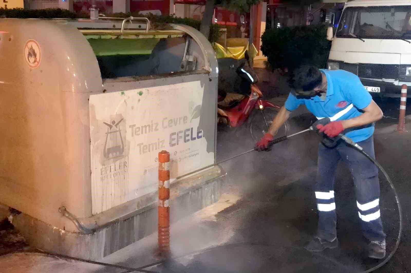 Efeler Belediye Başkanı Anıl Yetişkin ve çalışma arkadaşları; daha yaşanılabilir bir şehir için faaliyetlerine sabahın ilk ışıklarında başlayıp gecenin geç saatlerine kadar sürdürüyor. Daha temiz bir Efeler için alın teri akıtan Temizlik İşleri Müdürlüğü ekipleri, gün boyunca çöpleri toplayıp, sokak, cadde ve kaldırımları adım adım süpürüyor. Bakteri ve sinek oluşumunun önüne geçmek, kötü koku yayılımını durdurmak ve ilgili alana bağlı halk sağlığını olumsuz etkileyebilecek her türlü riski yok etmek için kollarını sıvayan ekipler, görev ve sorumluluk alanındaki çöp konteynerlerini tek tek yıkayıp dezenfekte ediyor.