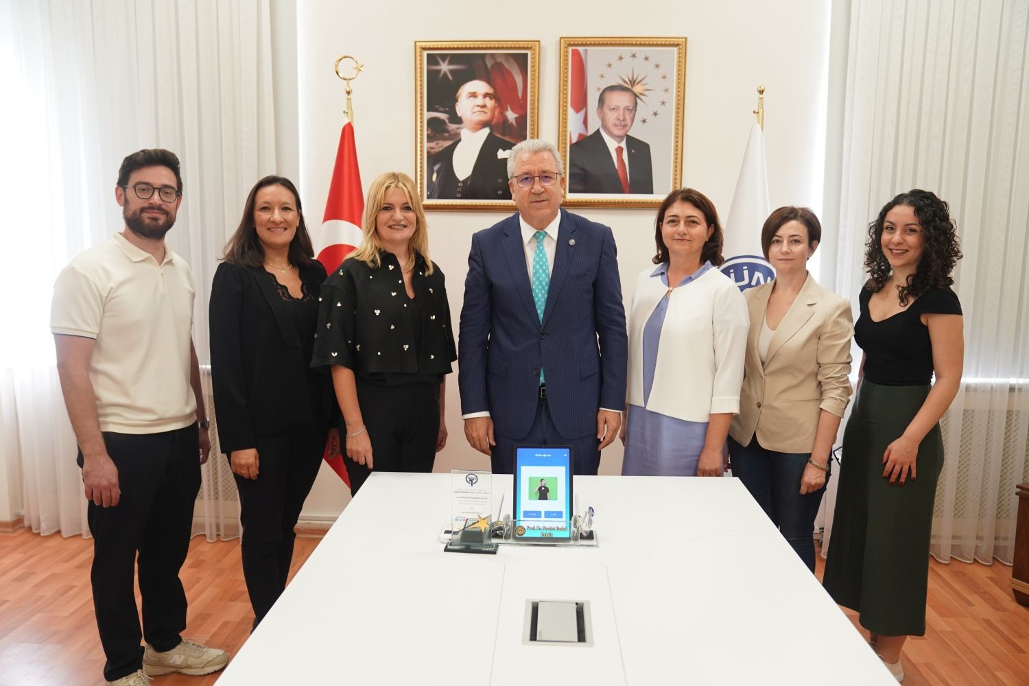 Diş Hekimliği Fakültesi Dekanı Prof. Dr. Nazan Ersin, Proje Yürütücüsü Prof. Dr. Esin Alpöz ve proje ekibi, Ege Üniversitesi Rektörü Prof. Dr. Necdet Budak’ı makamında ziyaret ederek, geliştirilen mobil uygulamayı anlattılar.