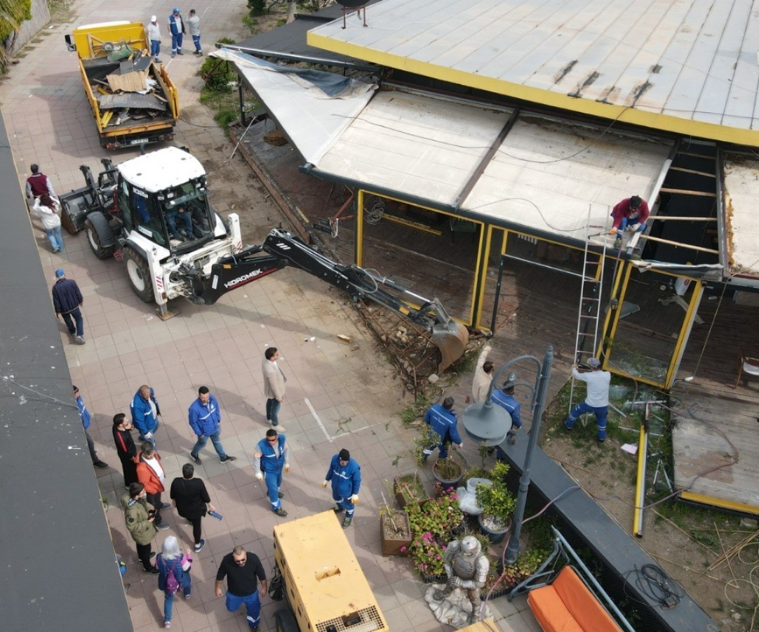 Sahil bandında imara aykırı olduğu tespit edilen bölümler iş makineleri yardımıyla kaldırılıyor. Sabah saatlerinde başlatılan çalışmalarda, işletmelerin ruhsata uygun olmayan ek alanları tek tek yıkılarak imar mevzuatına uygun hale getiriliyor. Bölgede zabıta ekipleri de güvenlik önlemleri alarak çalışmalara eşlik ediyor. Yapılan düzenlemeyle birlikte sahil bandının imar planına uygun hale getirilmesi ve kamu kullanımına açık alanların korunması amaçlanıyor.