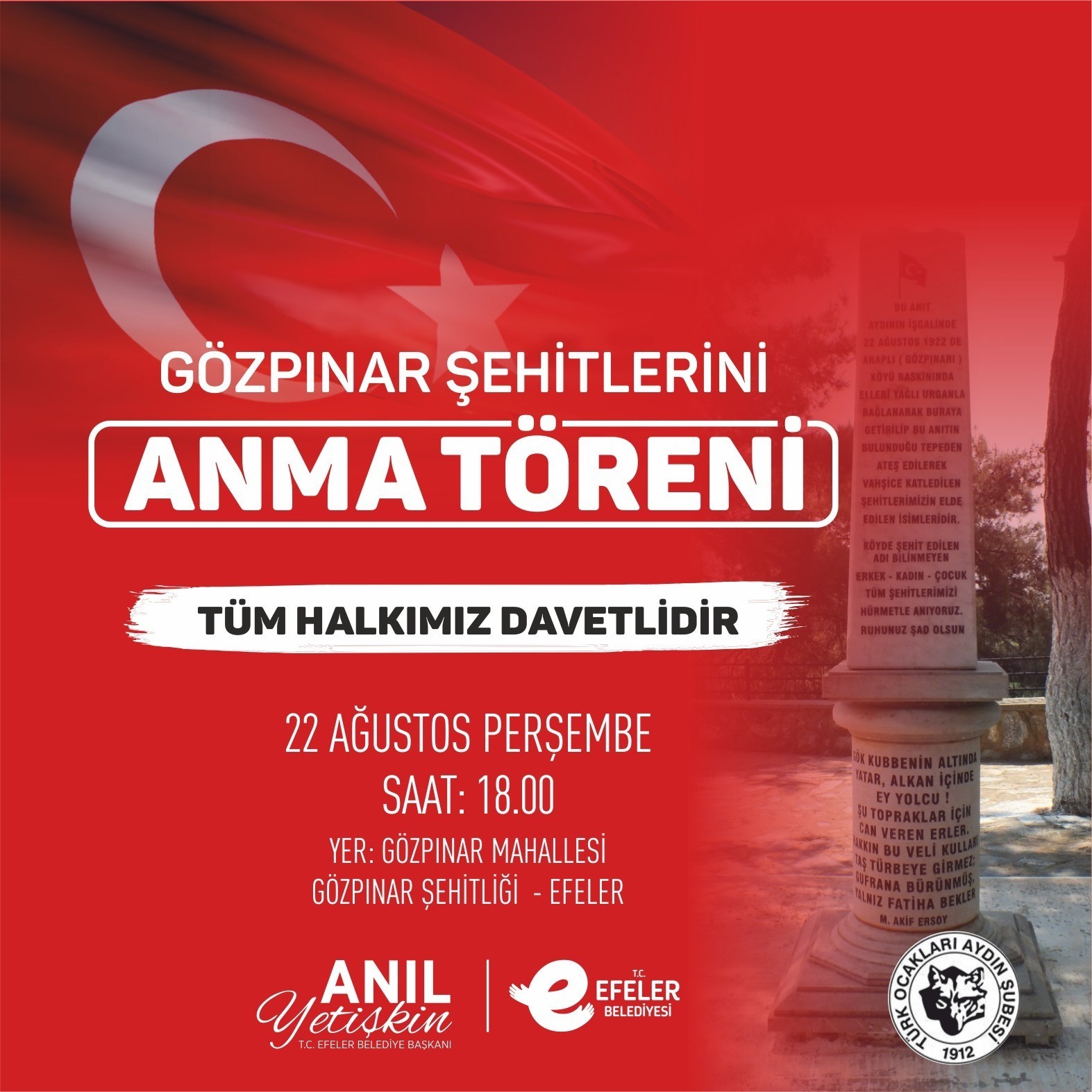 Efeler Belediyesi, Gözpınar Mahallesi Muhtarlığı ve Türk Ocakları Aydın Şubesi iş birliğiyle düzenlenecek etkinlikte Gözpınar Şehitleri’ni anacak.