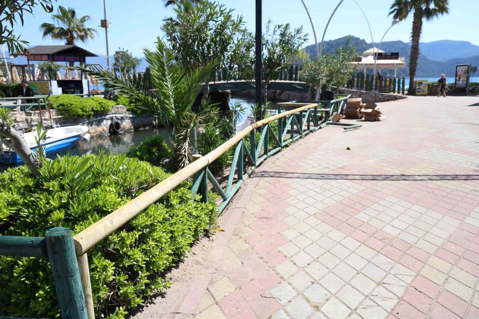 İçmeler’de dere kenarında bulunan ahşap korkuluklar ile dinlenme alanlarında yer alan bankların zamanla yıpranması üzerine bölge, Marmaris Belediyesi tarafından bakım programına alındı. Makine İkmal, Bakım ve Onarım Müdürlüğü koordinesinde yürütülen çalışmalar kapsamında ekipler, kullanım ömrünü tamamlayan ahşap korkulukları yenilerken, banklarda da gerekli onarım işlemlerini gerçekleştiriyor.