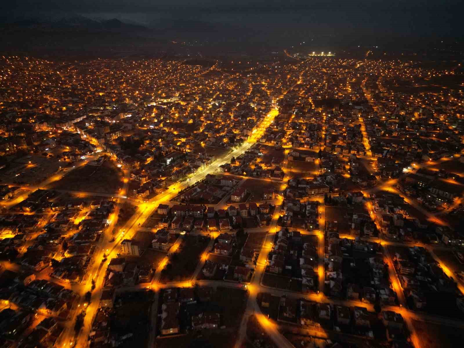Afyonkarahisar’ın Bolvadin ilçesinde gün batımından hemen sonra dron ile çekilen ışıklar içindeki görüntüsü görenleri mest etti.