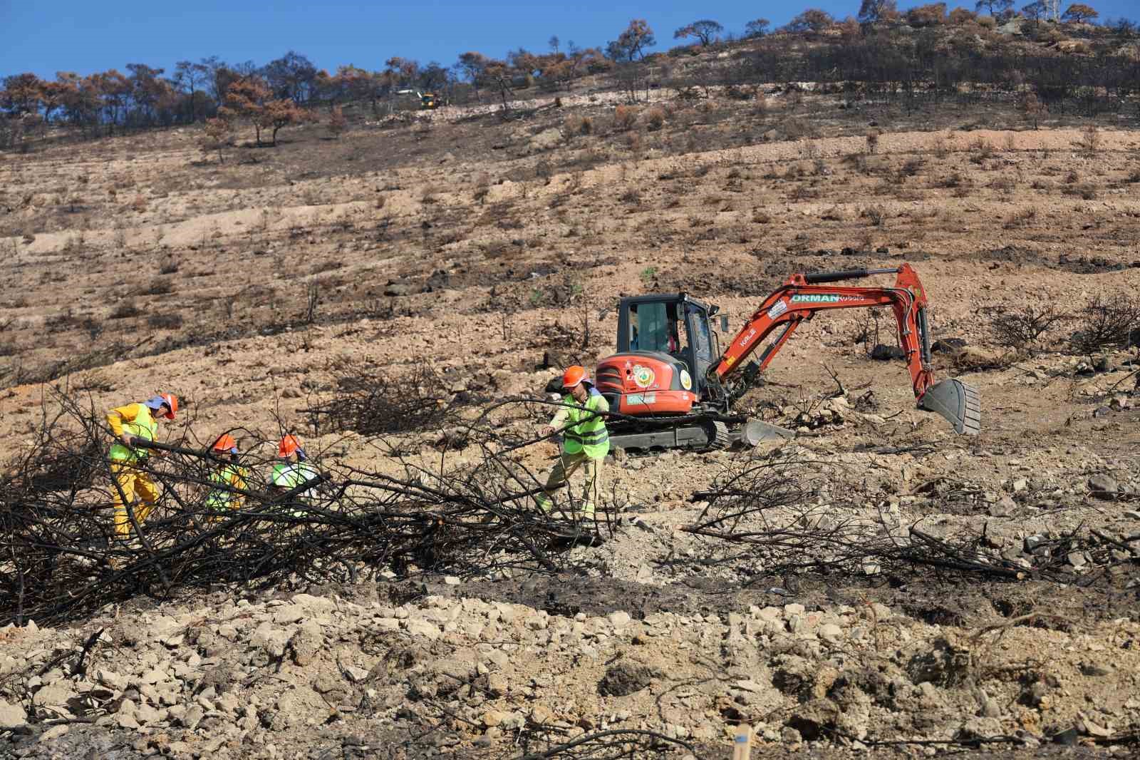 Çalışmaların devam ettiği bölgede incelemelerde bulunan Vali Elban, zarar gören bin 586 hektarlık alanın orman alanı olduğunu, bin 300 küsür hektarlık alanın ise mera, tarım arazisi ve yerleşim yeri olduğunu söyledi. Alanın tekrar ağaçlandırılması için yoğun bir şekilde çalışıldığını anlatan İzmir Valisi Süleyman Elban, alanda yanan ağaçların temizlendiğini kaydetti.