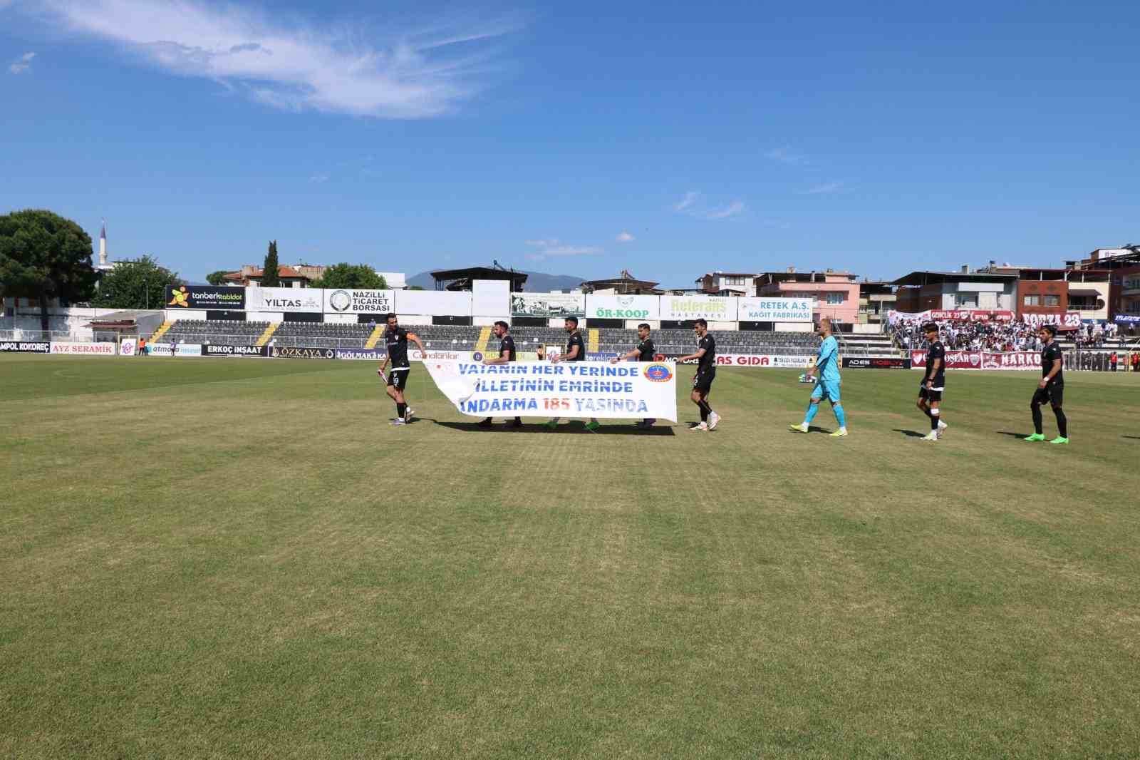Aydın İl Jandarma Komutanlığı tarafından Jandarma’nın 185. Kuruluş Yıldönümü Kutlama Etkinlikleri kapsamında Nazilli İlçe Stadyumu ve Spor Tesislerinde Efeler09 SFK-Elazığspor arasında oynanan TFF 3’ncü Lig Play Off futbol müsabakası öncesi durumsal farkındalık oluşturmak maksadıyla maç öncesi pankart açılarak hakem ve iki takım kaptanına çiçek takdim edildi. Jandarmanın her an milletin emrinde olduğuna vurgu yapılan pankart sonrasında, sahaya çıkan jandarma ekipleri 2 takıma da başarılar diledi.