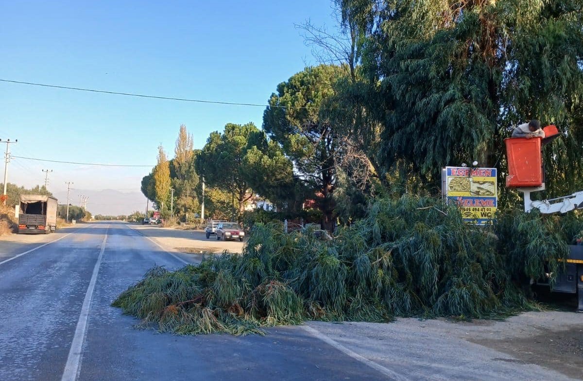 Aydın’ın Karacasu ilçesinde belediye ekiplerince seyir halindeki araçların görüşlerine engel olan ağaçların budaması yapılıyor.
