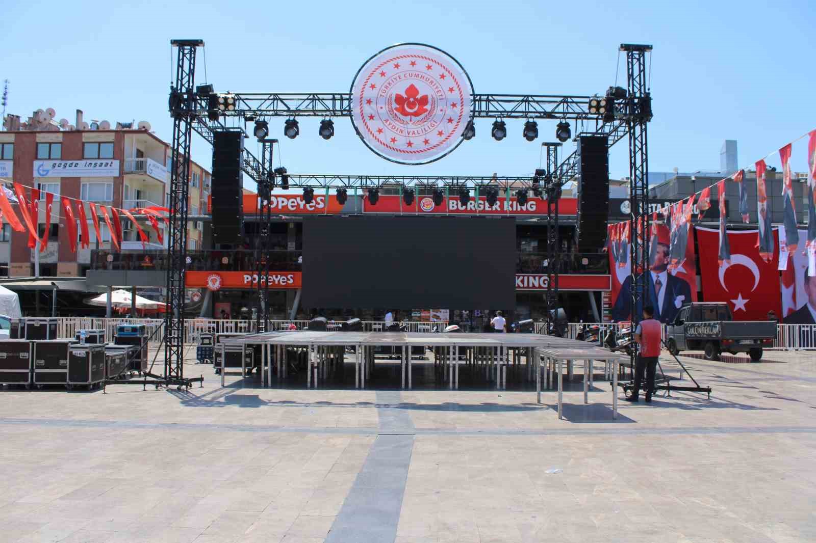 Aydın’ın Efeler ilçesinde akşam gerçekleştirilecek olan 15 Temmuz kutlamaları için Atatürk Kent Meydanı’nda hazırlıklar tamamlandı.
