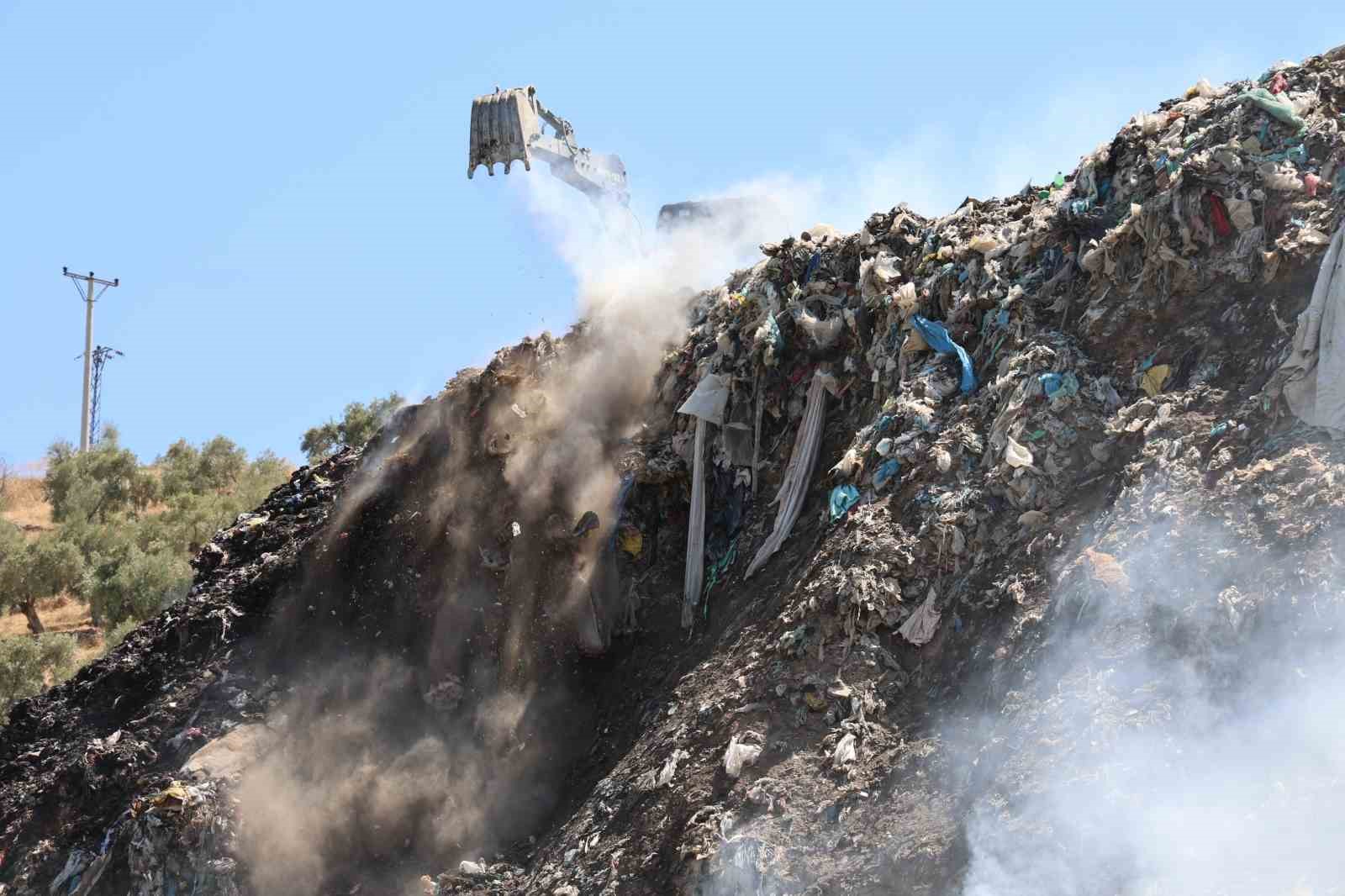 Bugün sabah saatlerinde yeniden yanmaya başlayan çöplük alanındaki yangını söndürmek için ekiplerin iş makinesi ve arazözlerle çalışmaları devam ediyor.