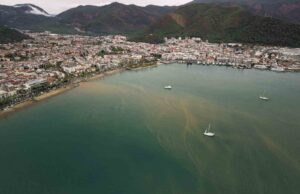 Muğla’nın Marmaris ilçesinde 2 gündür etkili olan sağanak yağış sonrasında denize dökülen yağmur suları ve fırtına sebebiyle iskeleye çarparak karaya oturan gezi teknesi havadan görüntülendi.Marmaris’te önceki gece yarısından itibaren etkili olan yağışlar aralıklı olarak devam ederken, ilçede dün şiddetli fırtına…