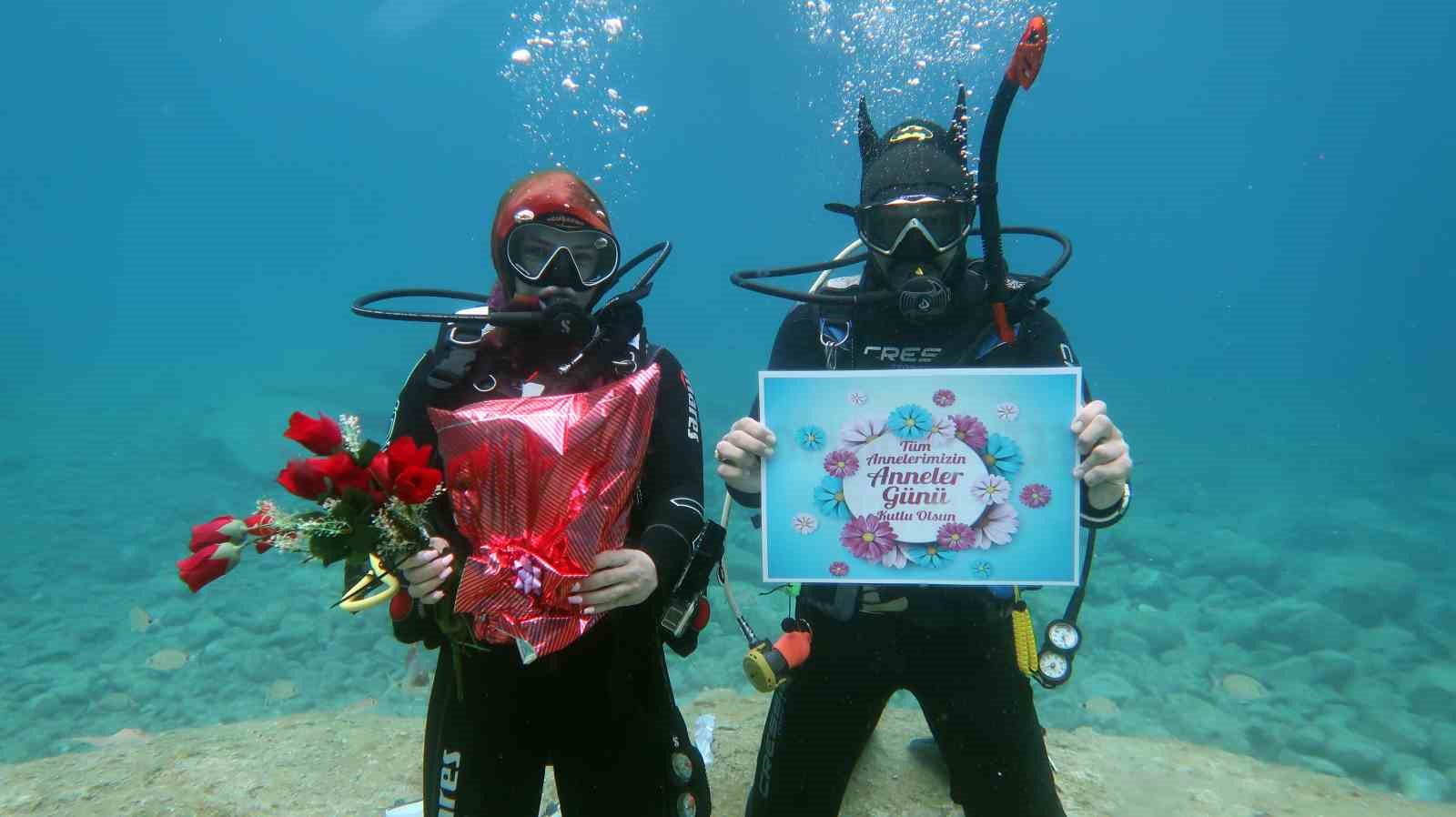 MUĞLA'NIN FETHİYE İLÇESİNDE DENİZİN 5 METRE ALTINA DALAN DALGIÇLAR, TÜM ANNELERİN ANNELER GÜNÜ'NÜ HAZIRLADIKLARI MİZANSEN İLE KUTLADI.
