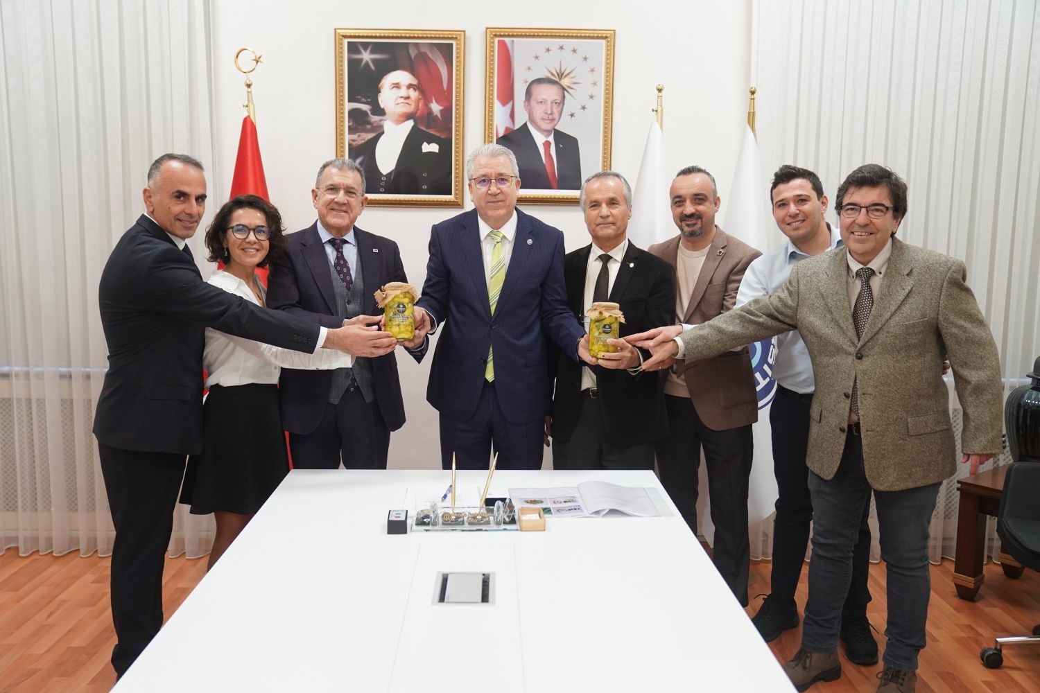 PROJE YÜRÜTÜCÜSÜ EÜ ZİRAAT FAKÜLTESİ BAHÇE BİTKİLERİ BÖLÜMÜ ÖĞRETİM ÜYESİ PROF. DR. İBRAHİM DUMAN, KFC GIDA A.Ş YÖNETİM KURULU BAŞKANI BİROL CELEP, PROJE ARAŞTIRMACILARI; PROF. DR. EFTAL DÜZYAMAN, PROF. DR. M. KADRİ BOZOKALFA, DR. TANSEL KAYGISIZ, ZİRAAT MÜHENDİSİ TUNCAY AFACAN VE FATİH MEHMET ÖZGÜVEN; EÜ REKTÖRÜ PROF. DR. NECDET BUDAK’I MAKAMINDA ZİYARET EDEREK PROJENİN DETAYLARINI PAYLAŞTI.