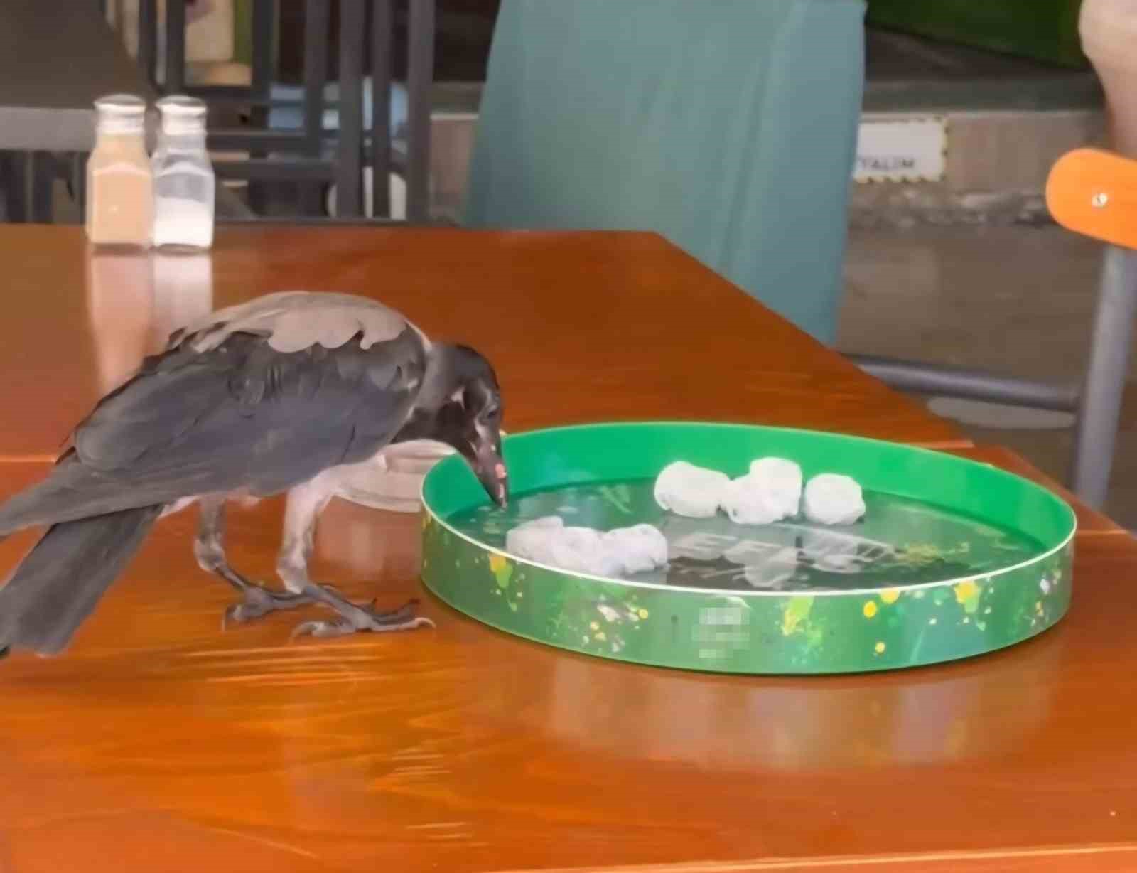 İŞLETME ÇALIŞANLARI, KARGAYA KÜL TABLASINA KOYDUKLARI SUYU İKRAM ETTİ.