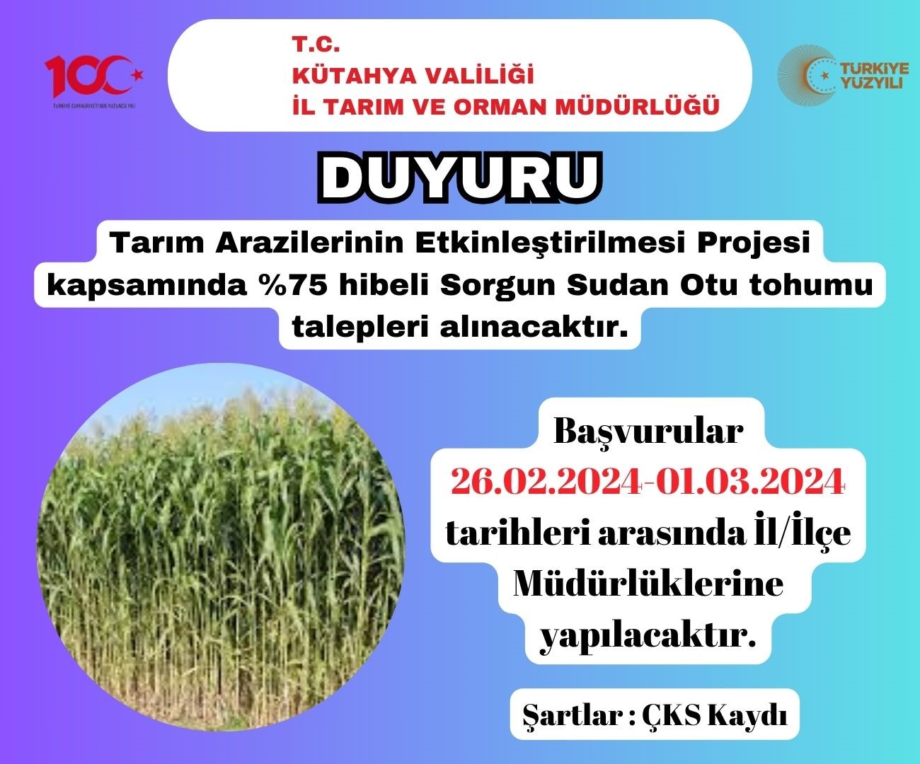 KÜTAHYA’DA ÜRETİCİLERE YÜZDE 75 HİBELİ SORGUN SUDAN OTU TOHUMU DAĞITILACAK
