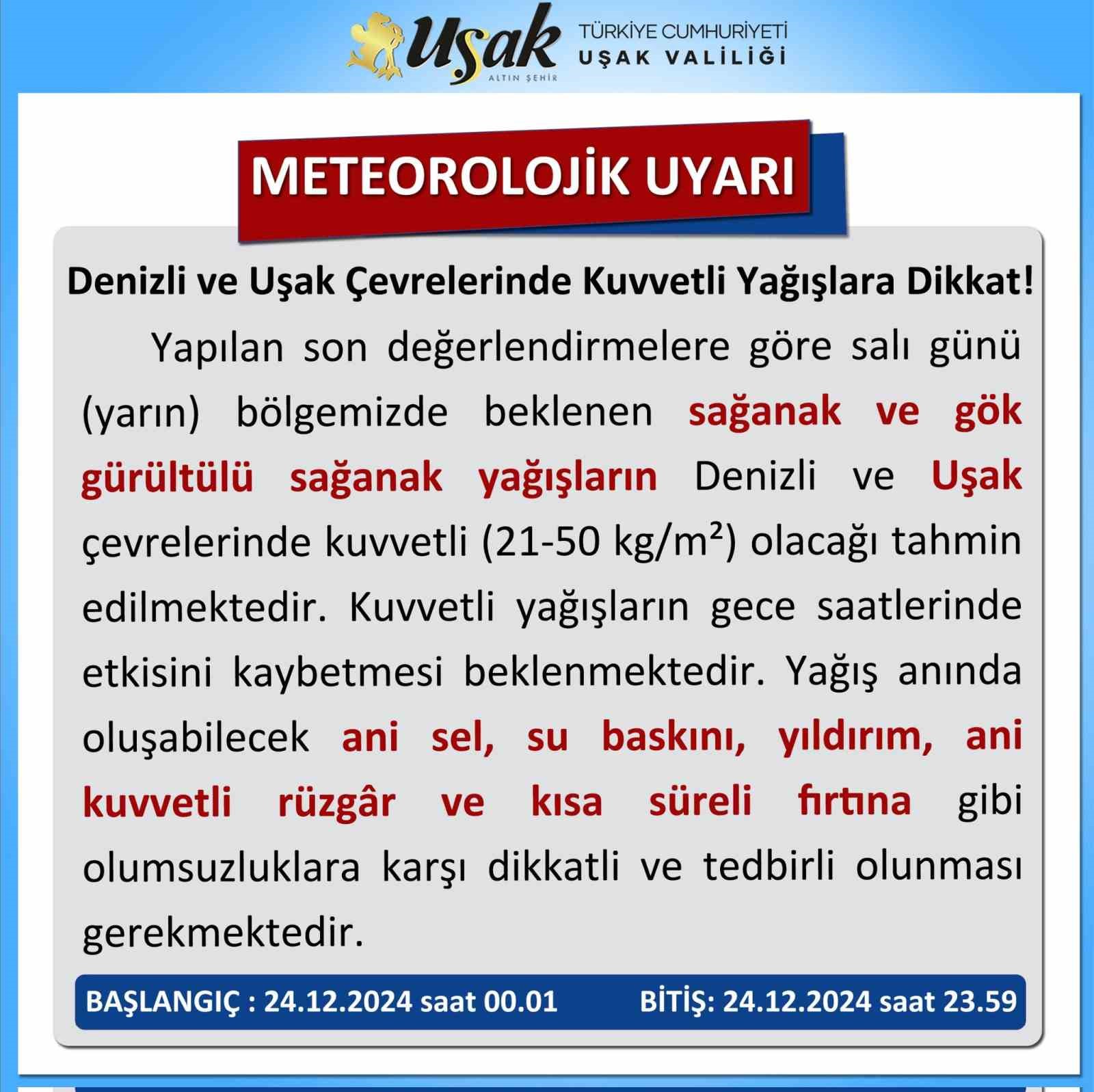 UŞAK VALİLİĞİ 24 ARALIK GÜNÜ İL GENELİNDE VE DENİZLİ ÇEVRESİNDE BEKLENEN KUVVETLİ YAĞIŞ İLE İLGİLİ VATANDAŞLARI UYARDI.