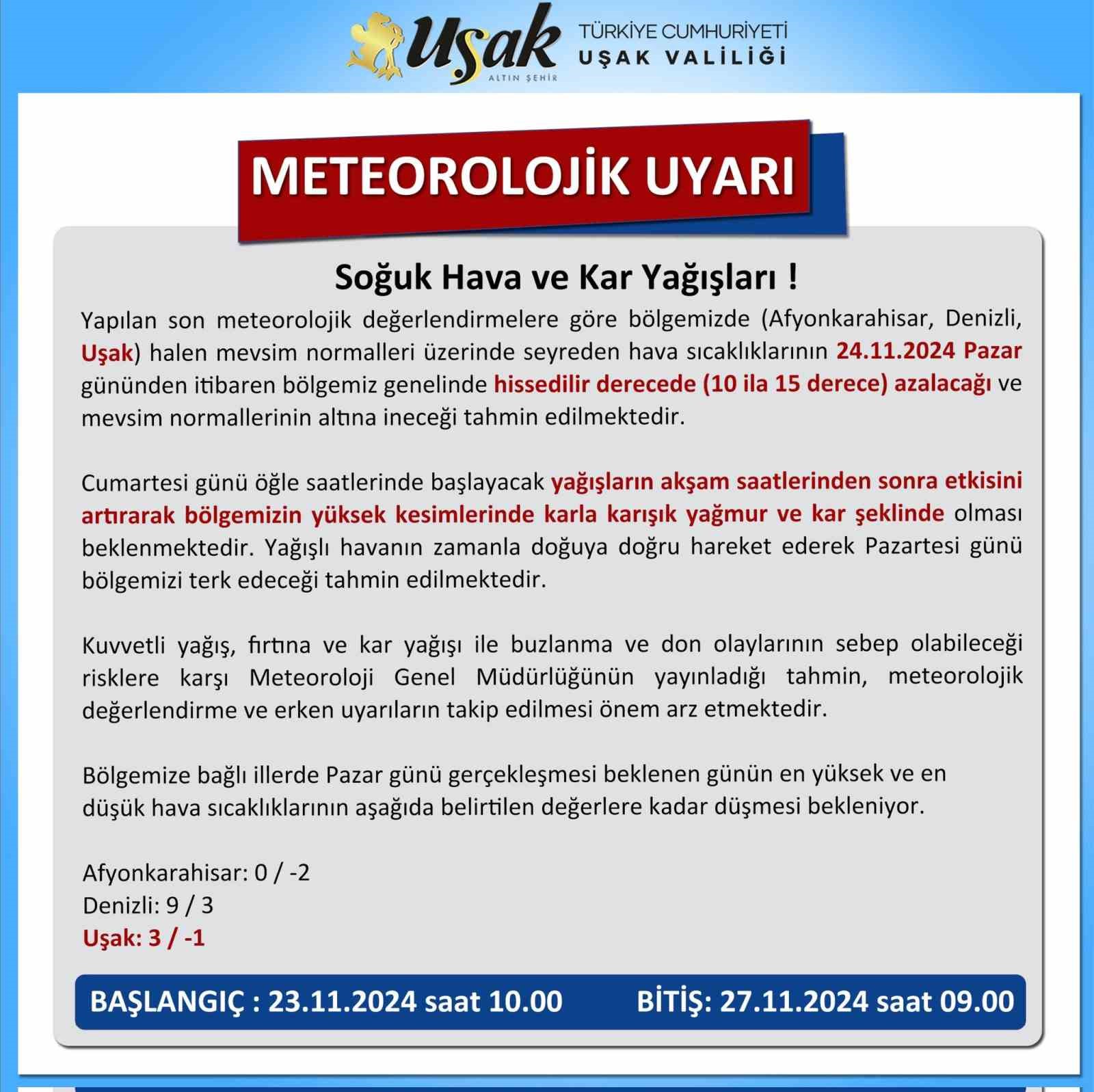 UŞAK VALİLİĞİ SOSYAL MEDYA ÜZERİNDEN YAPMIŞ OLDUĞU UYARIDA UŞAK İÇİN SOĞUK HAVA VE KAR YAĞIŞI UYARISINDA BULUNDU.