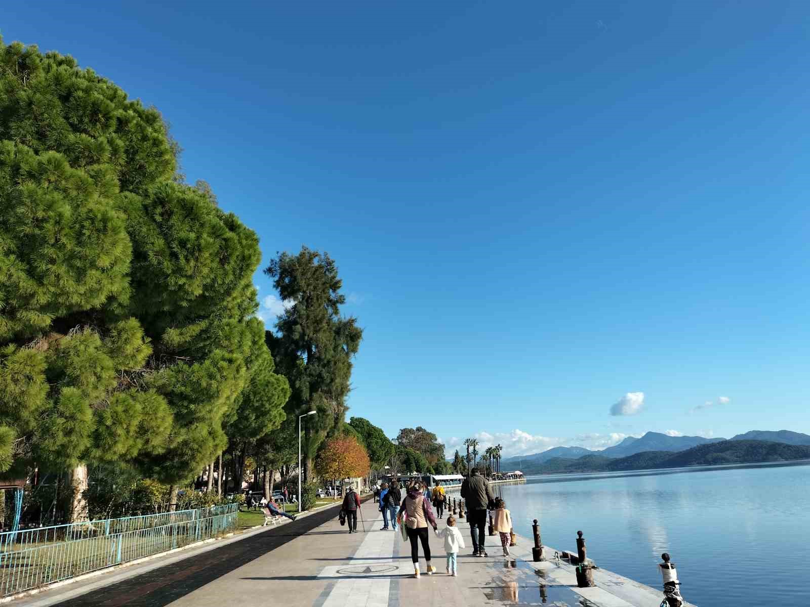 Muğla’nın Köyceğiz ilçesinde etkili olan sağanak yağışın ardından güneşli havayı fırsat bilen vatandaşlar kendilerini dışarı atarken, kordonda yoğunluk oluştu.