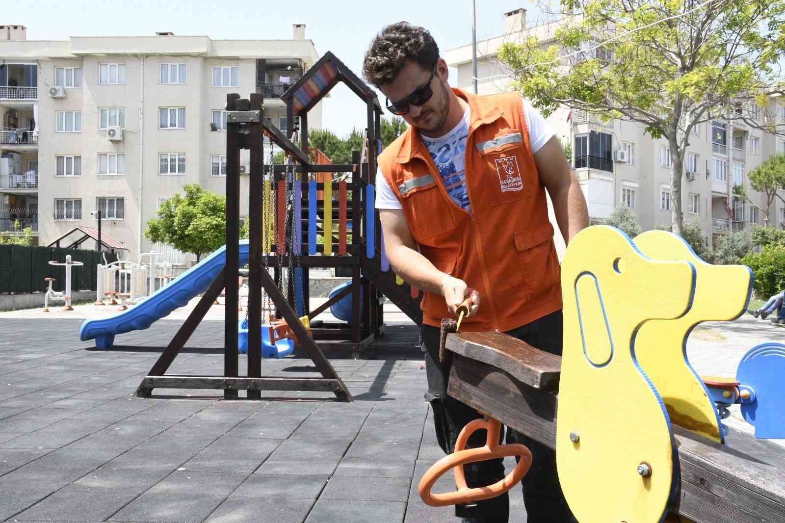 Kuşadası Belediyesi kent genelindeki park ve yeşil alanların sayısını her geçen gün arttırırken bir yandan da mevcut parklarda bakım ve temizlik çalışması yürütüyor. Bu kapsamda ekipler, eskiyen oyun grupları ve kauçuk zeminleri yenileyerek çocukların eğlence alanlarını temiz ve konforlu bir hale getiriyor.