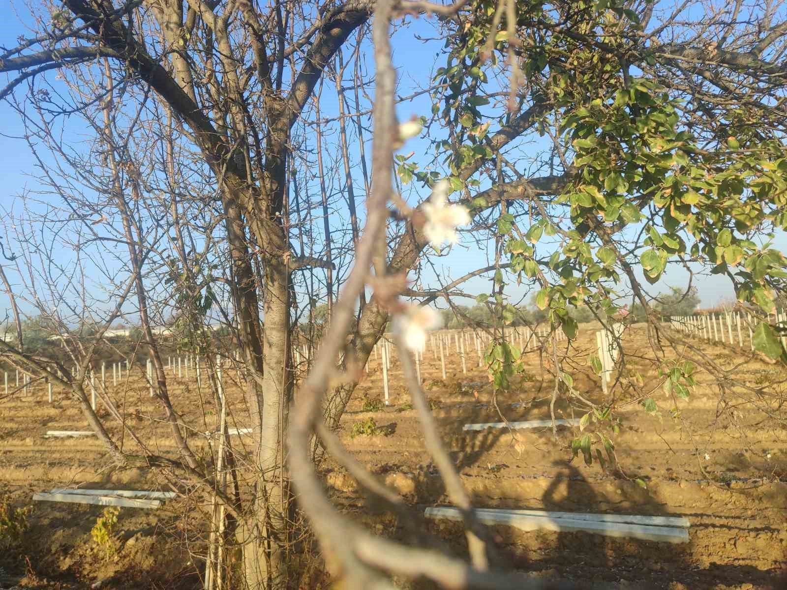 Üretici Emin Çepel’e ait üzüm bağında çalışan işçiler, erik ağacın çiçek açtığını gördü. Üzüm işçisi Bahri Çınar, “Bugün 27 Kasım 2024 yeni mahsulümüz hayırlı uğurlu olsun. Allah yedirmeyi nasip etsin” dedi.
