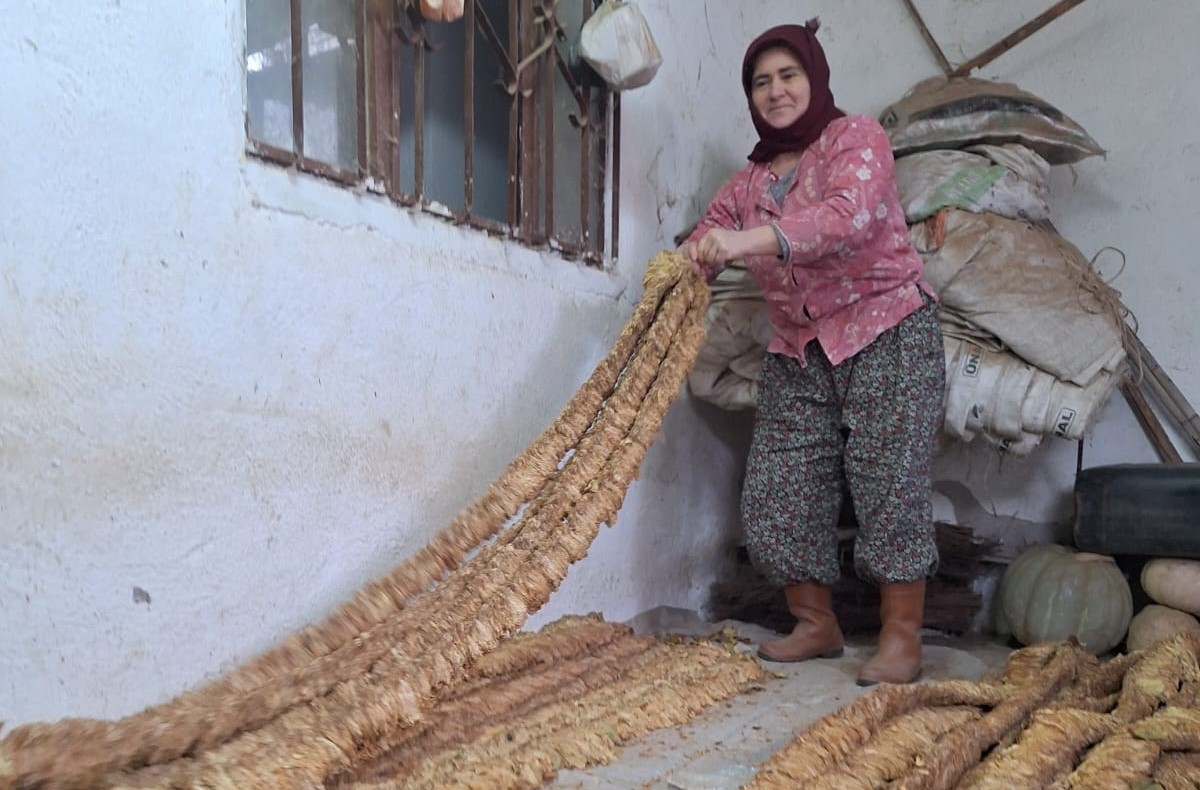 Manisa’nın Sarıgöl ilçesine bağlı Kızılçukur Mahallesinde eski yöntemlerle tütün yetiştiren üretici Leyla Zeybek 8 dekarlık tarlasına dikimini yaptığı tütünlerden 500 kilogram tütün elde etti.