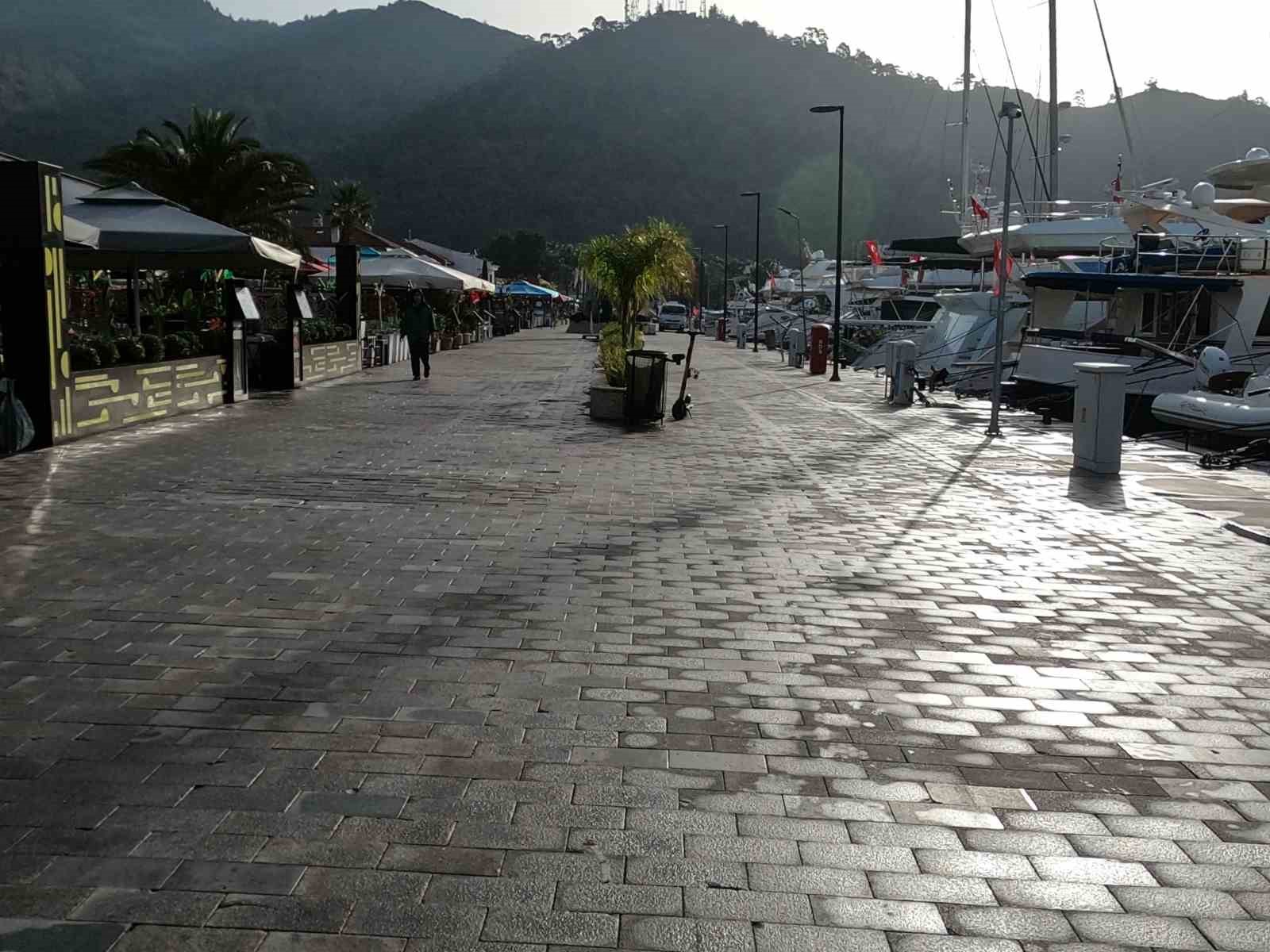 Her gün binlerce kişiyi ağırlayan Yat Limanı ve Barlar Sokağı, Marmaris Belediyesi ekiplerinin yoğun çalışmasıyla tertemiz oluyor.