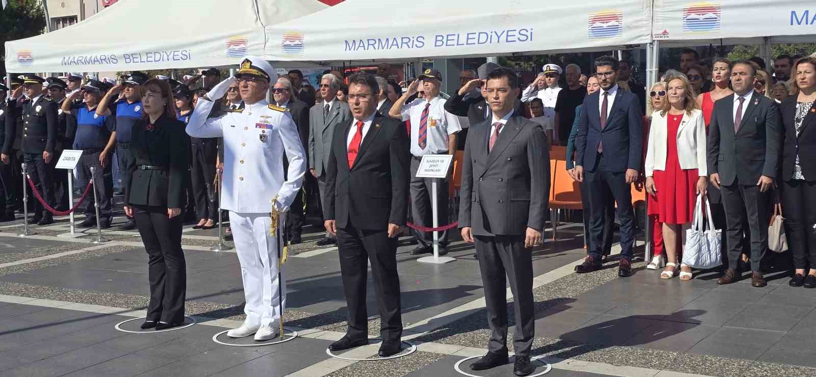 Marmaris Atatürk Meydanı’nda düzenlenen törende Marmaris Kaymakamı Nurullah Kaya, Aksaz Deniz Üs Komutanı Neslim Eski ve Marmaris Belediye Başkanı Acar Ünlü Atatürk anıtına çelenk sundu. Aksaz Askeri Bandosu’nun eşliğinde, saygı duruşu ve İstiklal Marşı okunması ile başlayan törene Marmaris Kaymakamı Nurullah Kaya, Aksaz Deniz üs komutanı Neslim Eski, Marmaris Belediye Başkanı Acar Ünlü, Marmaris Cumhuriyet Başsavcısı Fatmagül Yörük, İlçe Jandarma Komutanı Binbaşı Berker Dongul, İlçe Emniyet Müdürü Emre Alay, siyasi parti başkanları, STK temsilcileri, ilçedeki kurum ve kuruluş müdürleri katılım sağladı.