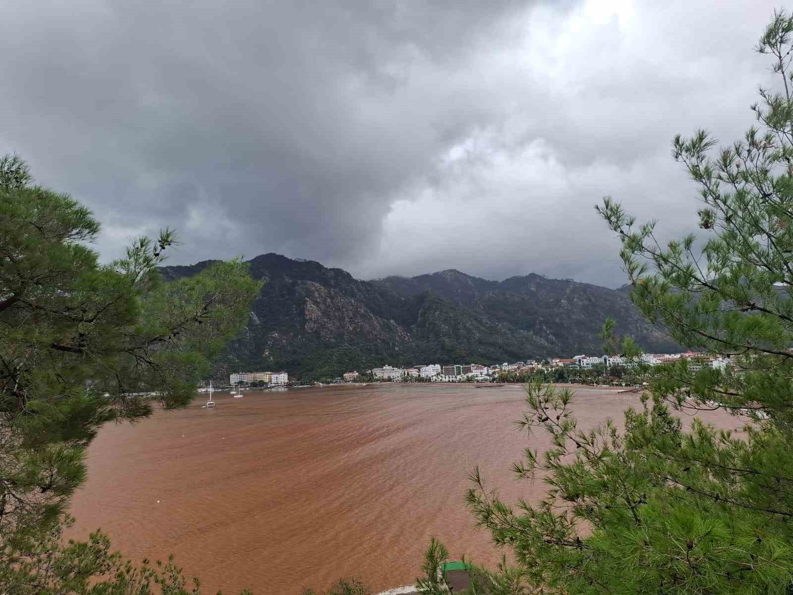 Muğla’nın Marmaris ilçesinde devam eden sağanak yağışlar ilçe genelinde etkili olurken sokaklar dereye, denizin rengi kahverengiye döndü.