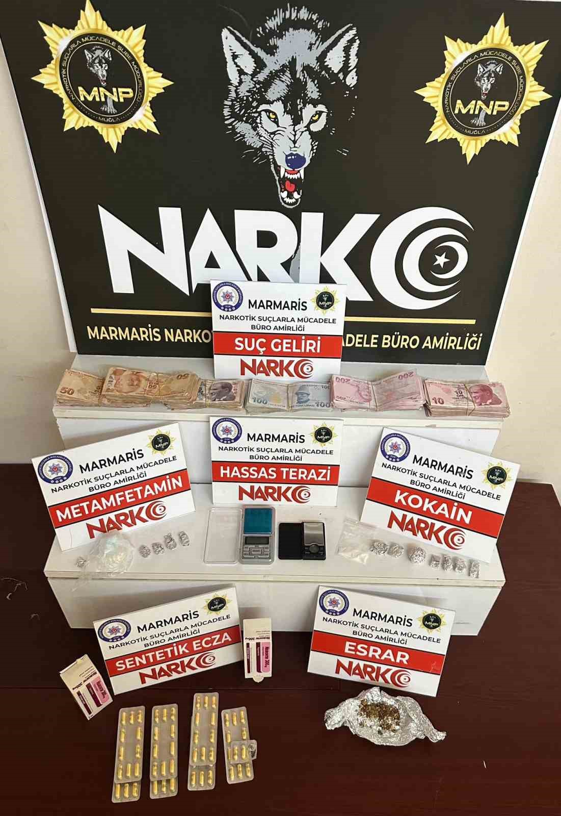 Marmaris Cumhuriyet Başsavcılığı koordinesinde Muğla Narkotik Suçlarla Mücadele Şube Müdürlüğüne bağlı Marmaris şube amirliği ekipleri tarafından gerçekleştirilen operasyon kapsamında şüphelilerin kaldığı otel odası ve araçlarında arama yapıldı. 21 Kasım tarihinde yapılan operasyonla 3 kişi gözaltına alınarak emniyet merkezine getirildi. Yapılan aramalarda, 13 gram metamfetamin, 14 gram kokain, 72 adet sentetik ecza, 3.4 gram esrar, 2 hassas terazi ile 27 bin 110 TL, 100 dolar, 115 pound ve 20 euro suçtan elde edildiği değerlendirilen para ele geçirildi. Marmaris’e ziyaret amaçlı geldikleri değerlendirilen şüpheli şahıslar emniyetteki gözaltı işlemlerinin tamamlanmasının ardından Marmaris Adliyesi’nde hakim karşısına çıkarıldı. İkisi kadın 3 şüpheli hakkında uyuşturucu ticareti suçundan adli işlem yapılırken, şüpheliler tutuklanarak cezaevine gönderildi.